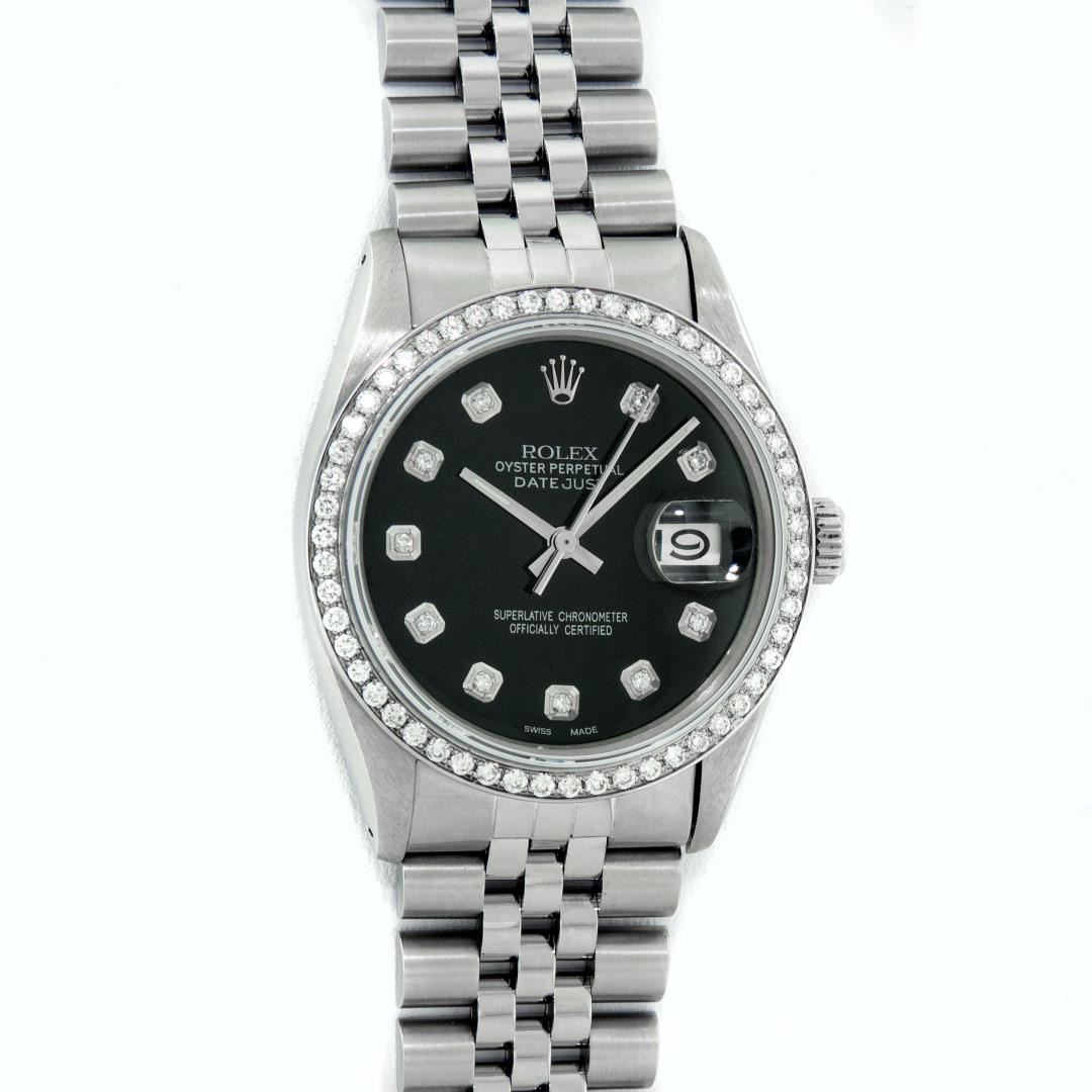 One 36MM Pre Owned Rolex Stainless Steel Datejust Polished Bright with Satin Finish, This Watch Has Been Serviced & Electronically Tested, Rolex Stainless Steel Case: 36mm, Rolex Stainless Steel Crown, Custom Bezel: New Stainless Steel Beadset Diamond Bezel, Diamond Count: 54 Diamonds On Bezel. Custom Crystal: New Sapphire With Date Window. Custom Hands: New Luminescent Hands. Rolex Movement: Automatic Winding Movement 3035. Custom Dial: Custom Black Dial With Added Diamonds, Diamond Count: 10 Diamonds On Dial. Date Window: 3 O'Clock Position Date Display, Quickset, Model: Datejust. Condition: G-6 Extra Fine. Rolex Bracelet: Stainless Steel Jubilee Band. Bright Polish & Satin Finish. 7.0 Inch Length, Adjustable. Fold Clasp, With Rolex Logo. This Watch Has Been Serviced Time Tested And Is In Excellent Condition It Is Free Of All Scratches And Dents.