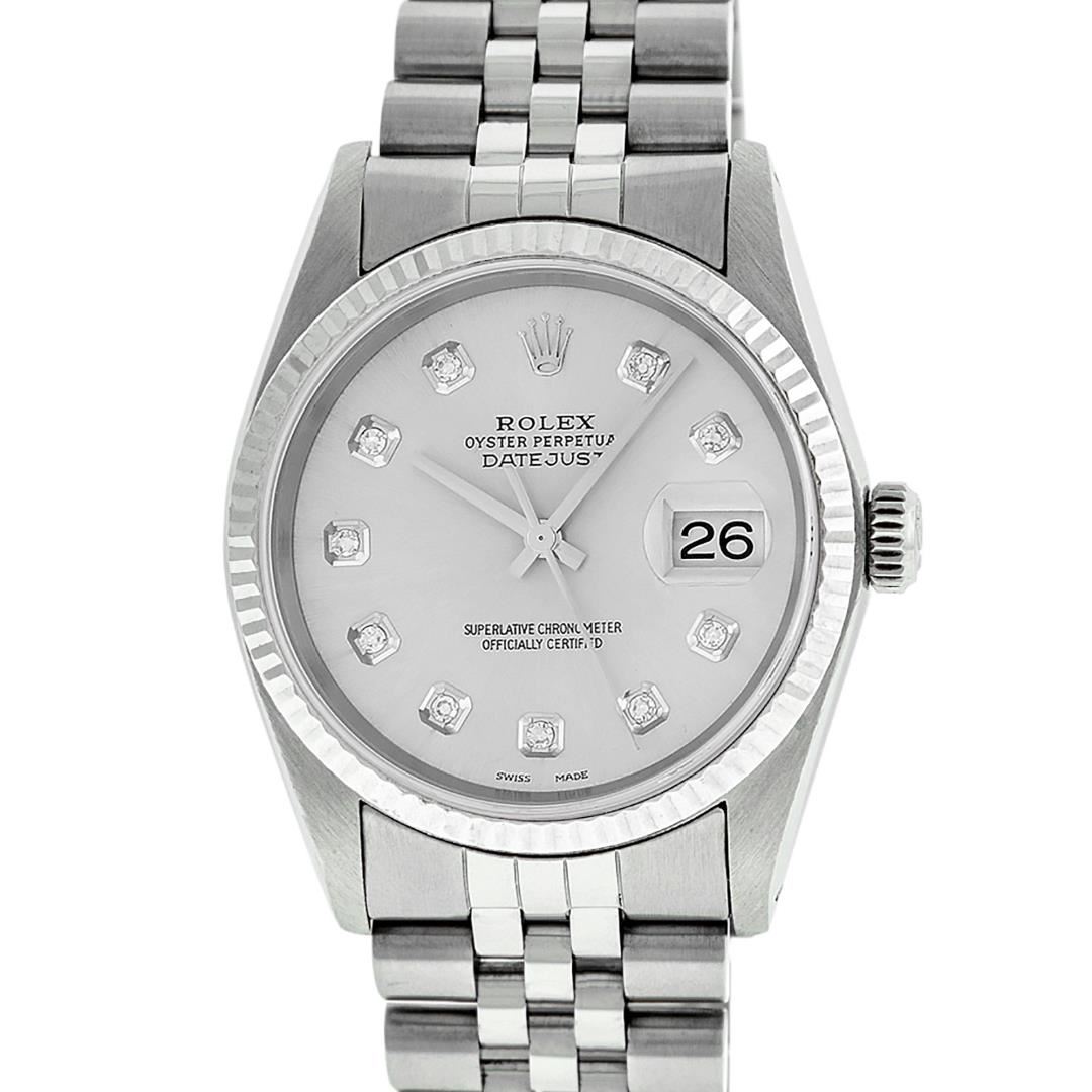 One Pre Owned Stainless Steel Rolex 36MM Datejust Polished Bright with Satin Finish, Serviced & Electronically Tested, Rolex Stainless Steel Case: 36mm, Rolex Stainless Steel Crown, Rolex Bezel: White Gold Fluted Bezel. Custom Crystal: New Plexiglass With Magnified Date Window. Custom Hands: New Hands. Rolex Movement: Automatic Winding Movement 3035. Custom Dial: Custom Silver Dial With Added Diamond Hour Markers, Diamond Count: 10 Diamonds On Dial. Date Window: 3 O'Clock Position Date Display, Quickset, Model: Datejust, Condition: G-6 Extra Fine. Rolex Bracelet: Stainless Steel Jubilee Band. Bright Polish & Satin Finish. 7.0 Inch Length, Adjustable. Fold Clasp, With Rolex Logo. This Watch Has Been Serviced And Polished It Is Free Of All Scratches And Dents.