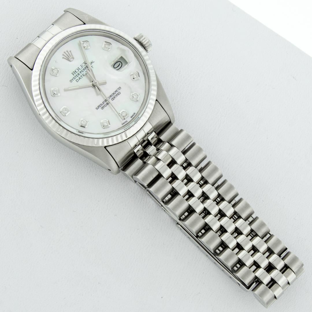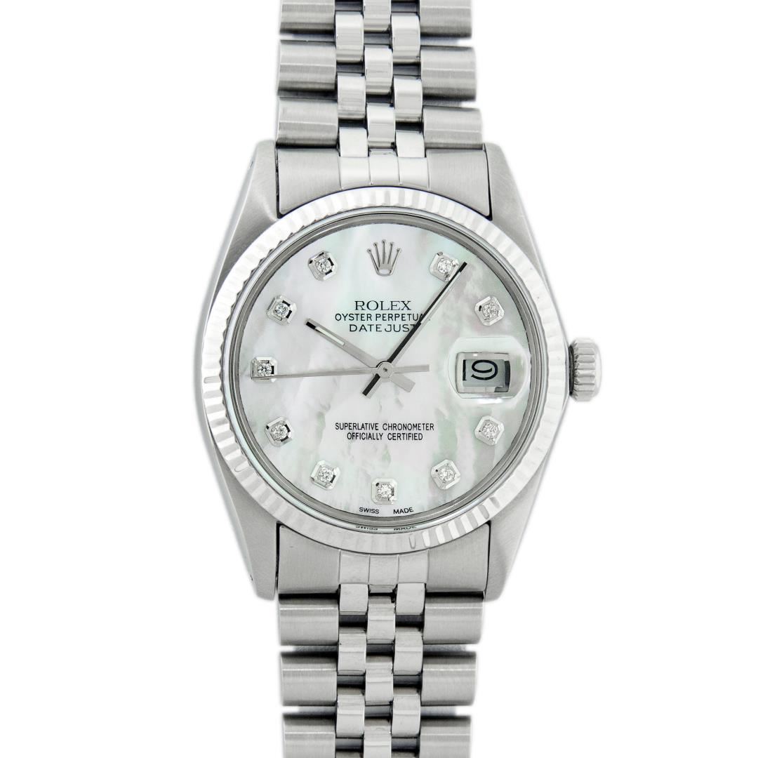 One Mens 36MM Stainless Steel Rolex Datejust Polished Bright with Satin Finish, This Watch Has Been Serviced & Electronically Tested, Rolex Stainless Steel Case: 36mm, Rolex Stainless Steel Crown, Rolex Bezel: 14K White Gold Fluted Bezel. Custom Crystal: New Acrylic With Magnified Date Window. Custom Hands: New Luminescent Hands. Rolex Movement: Automatic Winding Movement 3035. Custom Dial: Custom White Diamond Dial With Added Diamond Hour Markers, Diamond Count: 10 Diamonds On Dial. Date Window: 3 O'Clock Position Date Display, Quickset, Model: Datejust, Condition: G-6 Extra Fine. Rolex Bracelet: Stainless Steel Jubilee Band. Bright Polish & Satin Finish. 7.0 Inch Length, Adjustable. Fold Clasp, With Rolex Logo. This Watch Has Been Serviced Time Tested And Is In Excellent Condition It Is Free Of All Scratches And Dents.