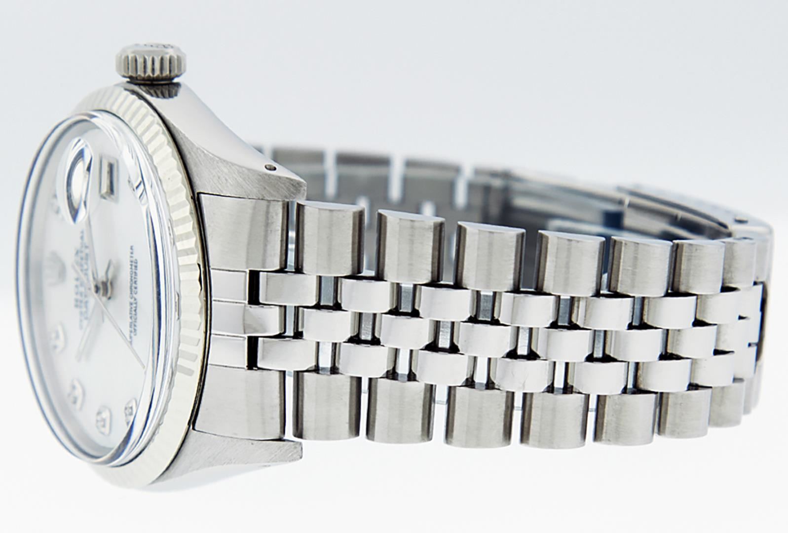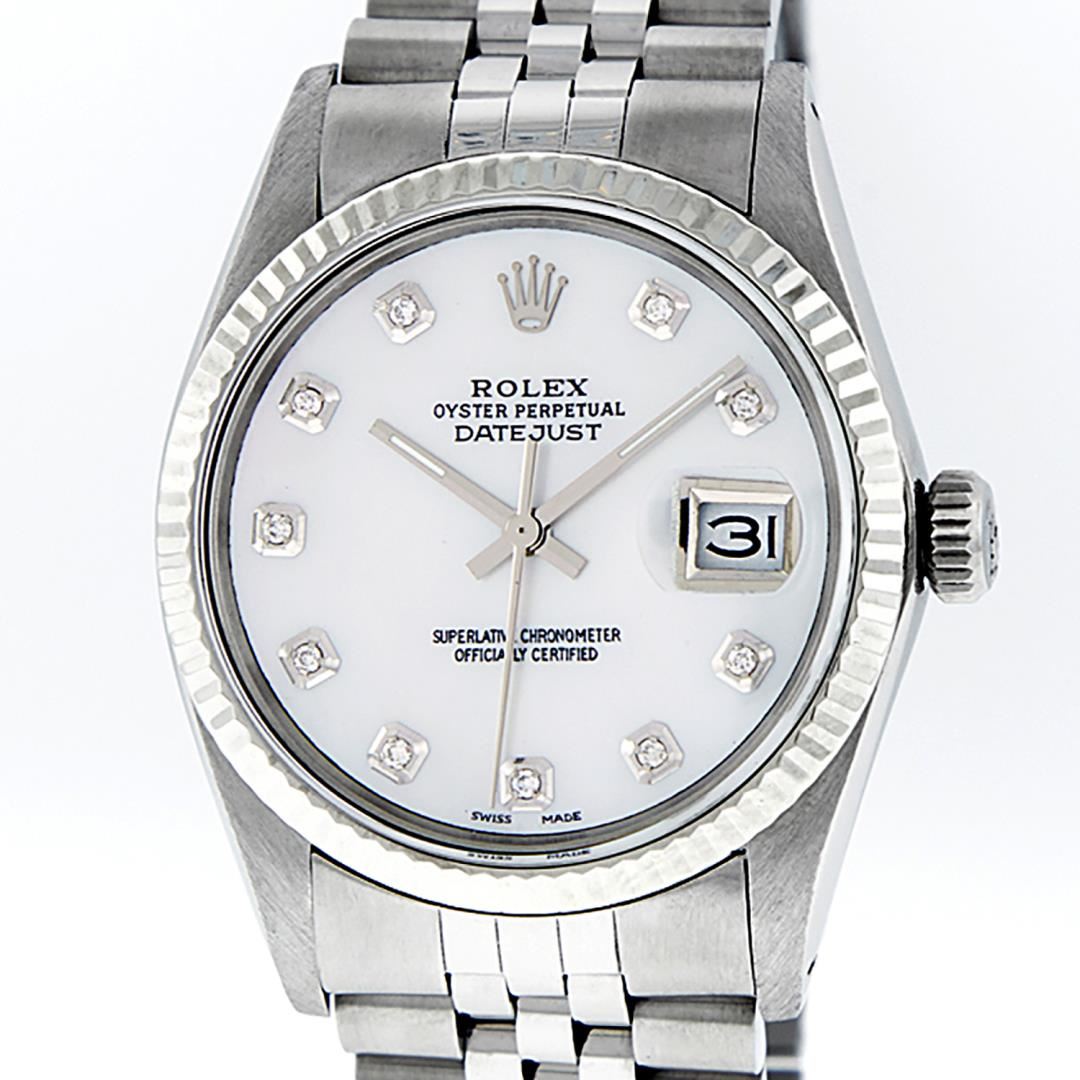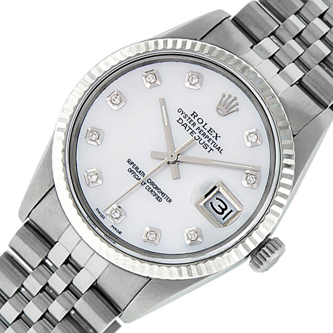 One Mens 36MM Stainless Steel Rolex Datejust Polished Bright with Satin Finish, This Watch Has Been Serviced & Electronically Tested, Rolex Stainless Steel Case: 36mm, Rolex Stainless Steel Crown, Rolex Bezel: 14K White Gold Fluted Bezel. Custom Crystal: New Acrylic With Magnified Date Window. Custom Hands: New Luminescent Hands. Rolex Movement: Automatic Winding Movement 3035. Custom Dial: Custom White Diamond Dial With Added Diamond Hour Markers, Diamond Count: 10 Diamonds On Dial. Date Window: 3 O'Clock Position Date Display, Quickset, Model: Datejust, Condition: G-6 Extra Fine. Rolex Bracelet: Stainless Steel Jubilee Band. Bright Polish & Satin Finish. 7.0 Inch Length, Adjustable. Fold Clasp, With Rolex Logo. This Watch Has Been Serviced Time Tested And Is In Excellent Condition It Is Free Of All Scratches And Dents.