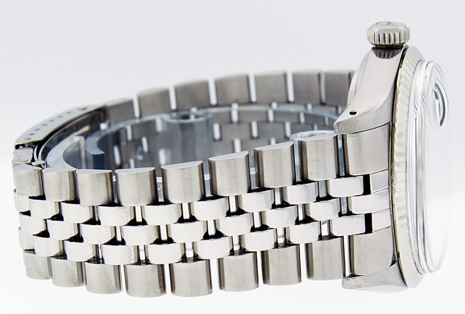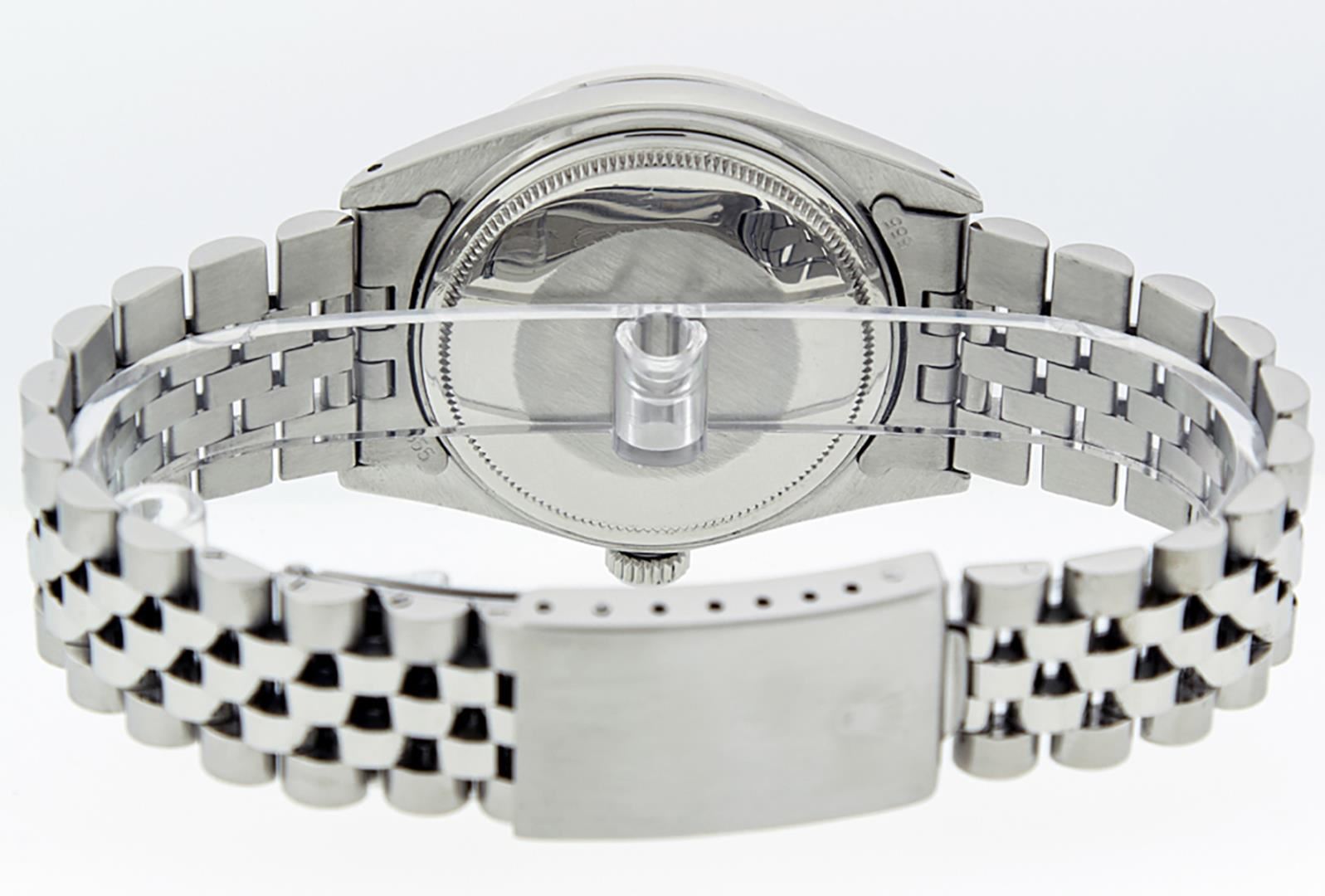 One Rolex Stainless Steel 36MM Datejust Polished Bright with Satin Finish, This Watch Has Been Serviced & Electronically Tested, Stainless Steel Case: 36mm, Stainless Steel Crown, Rolex Bezel: White Gold Fluted Bezel, Custom Crystal: New Sapphire With Magnified Date Window. Custom Hands: New Luminescent Hands. Rolex Movement: Automatic Winding Movement 3035. Custom Dial: Custom Black Diamond Dial With Added Diamond Hour Makers, Diamond Count: 10 Diamonds On Dial. Date Window: 3 O'clock Position Date Display, Quickset, Model: Datejust. Condition: G-6 Extra Fine. Rolex Bracelet: Stainless Steel Jubilee Band. Bright Polish & Satin Finish. 7.0 Inch Length, Adjustable. Standard Clasp, With Rolex Logo. This Watch Has Been Serviced Time Tested And Is In Excellent Condition It Is Free Of All Scratches And Dents.