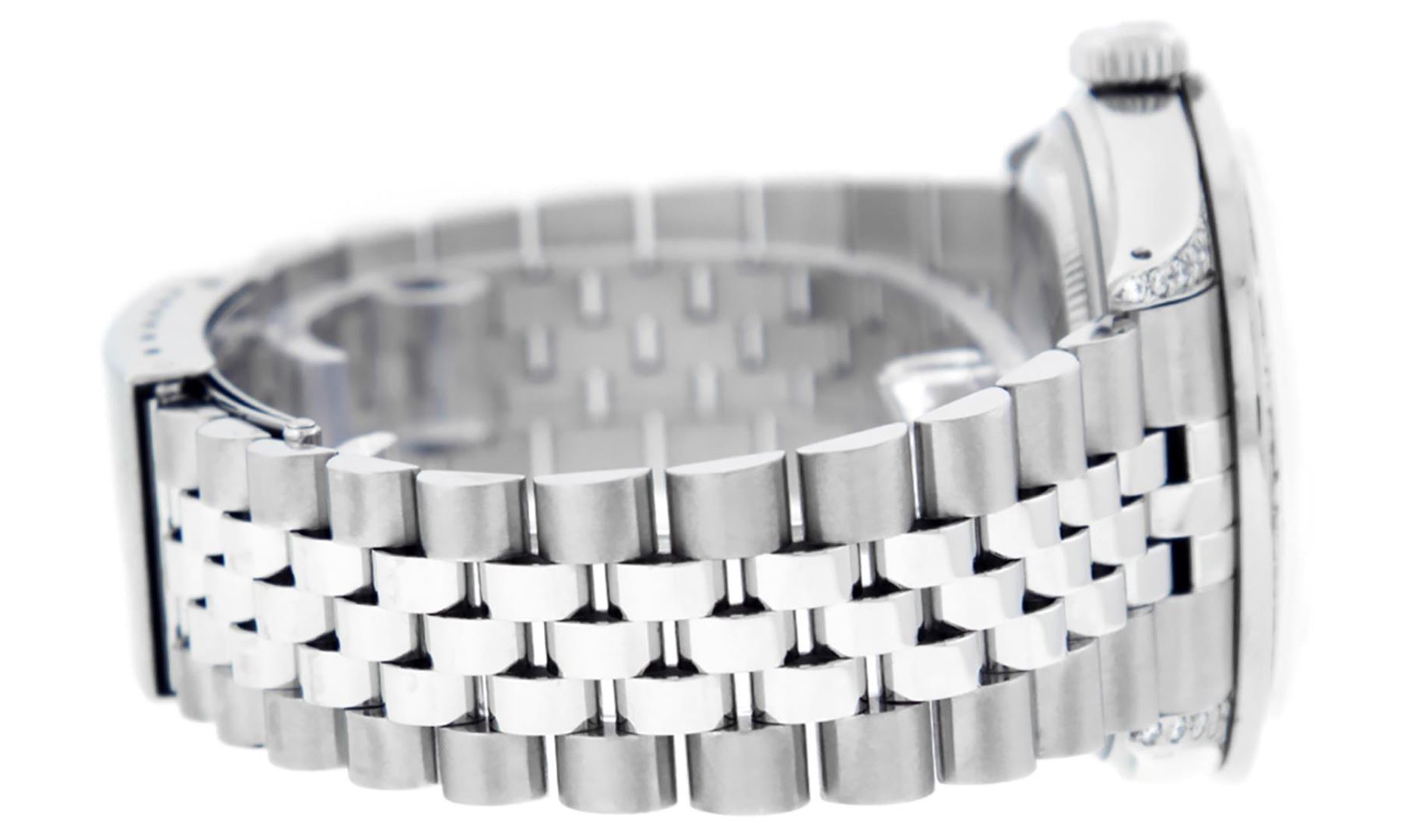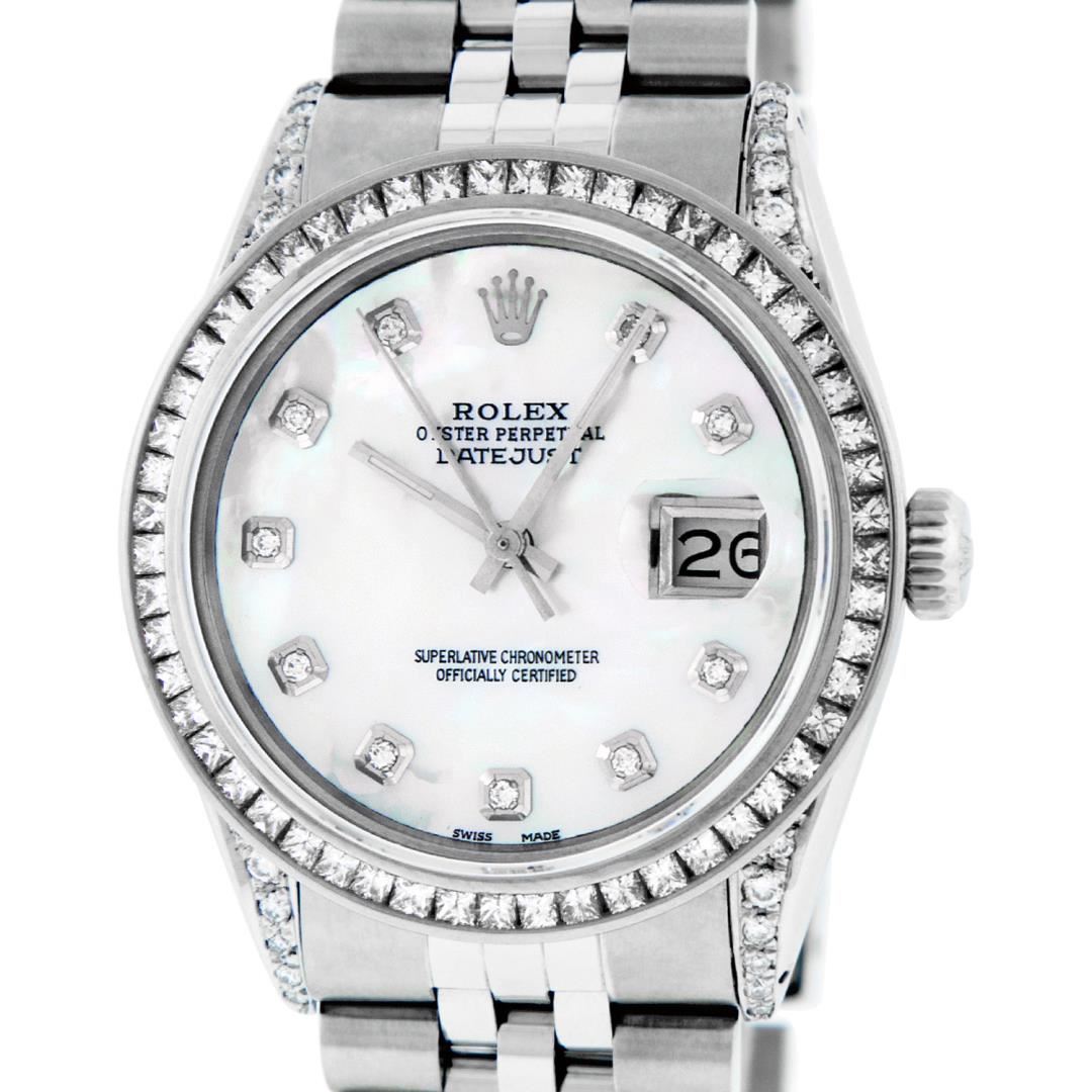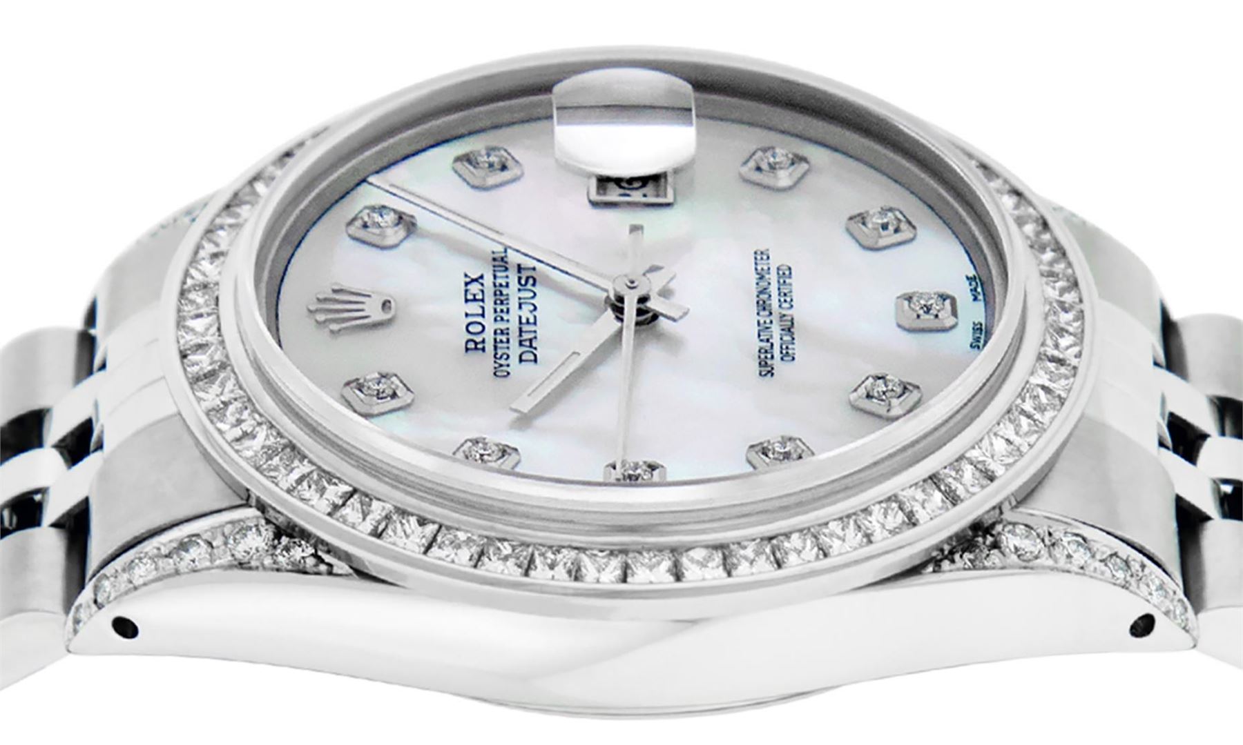 One Mens Pre Owned Stainless Steel Rolex Datejust Polished Bright with Satin Finish, Serviced And Electronically Tested, Rolex Stainless Steel Case: 36mm, Custom Diamond Lugs: 28 Added Diamonds On Lugs. Rolex Stainless Steel Crown, Custom Bezel: New 14K White Gold Princess Cut Diamond Bezel, Diamond Count: 53 Diamonds, Total Weight 2.75 Carat. Custom Crystal: New Sapphire With Magnified Date Window. Custom Hands: New Luminescent Hands. Rolex Movement: Automatic Winding Movement 3035. Custom Dial: Custom White Dial With Added Diamond Hour Markers, Diamond Count: 10 Diamonds On Dial. Date Window: 3 O'Clock Position Date Display, Quickset, Model: Datejust Condition: G-6 Extra Fine. Rolex Bracelet: Stainless Steel Jubilee Band. Bright Polish And Satin Finish. 7.0 Inch Length, Adjustable. Standard Clasp, With Rolex Logo. This Watch Has Been Serviced And Polished And Its Free Of All Dents And Scratches.