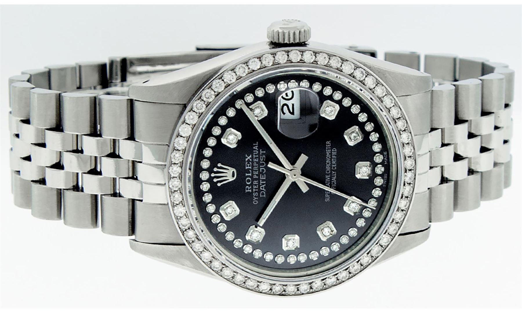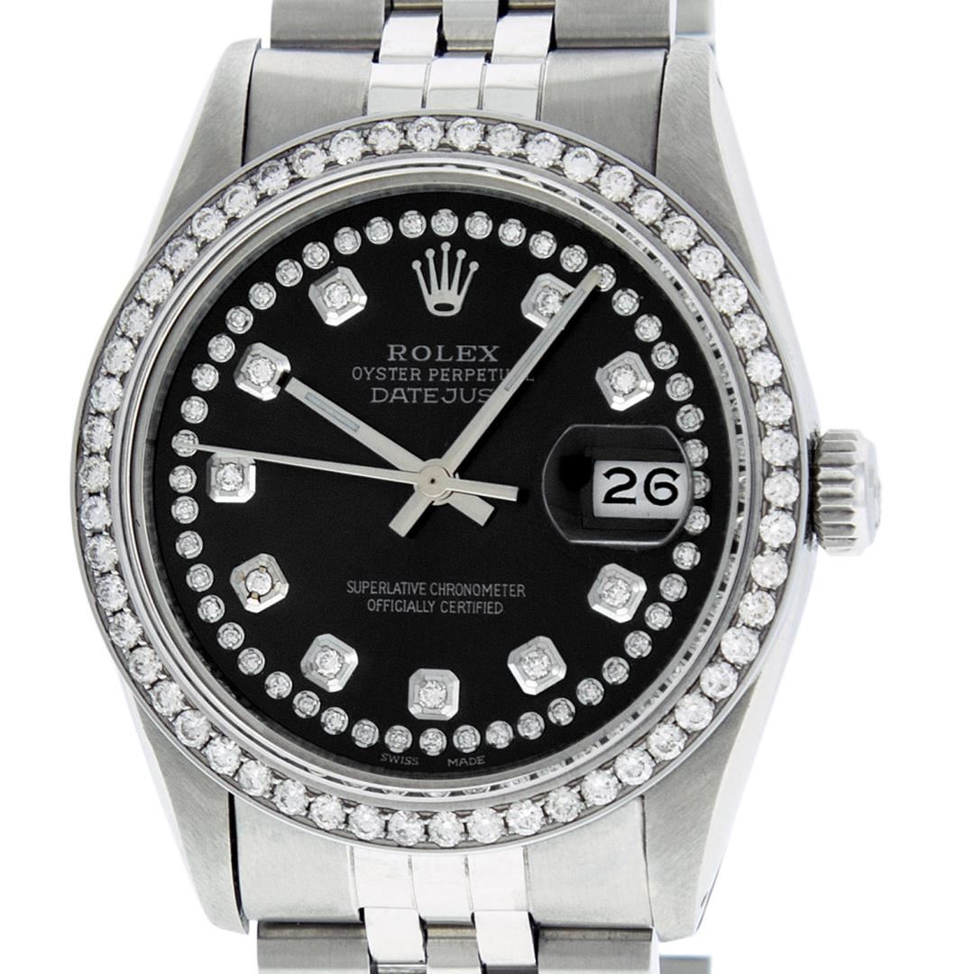 One Mens Pre Owned Rolex Stainless Steel Datejust Polished Bright with Satin Finish, Stainless Steel Case: 36mm, Stainless Steel Crown, Custom Bezel: New Stainless Steel Beadset Diamond Bezel, Diamond Count: 54 Diamonds. Custom Crystal: New Sapphire With Date Window. Custom Hands: New Luminescent Hands. Rolex Movement: Automatic Winding Movement 3035. Custom Dial: Custom Black Dial With Custom Added Diamonds, Diamond Count: 58 Diamonds In Dial. Date Window: 3 O'Clock Position Date Display, Quickset, Model: Quickset Datejust. Condition: G-6 Extra Fine. Rolex Bracelet: Stainless Steel Jubilee Band. Bright Polish And Satin Finish. 7.0 Inch Length, Adjustable. Standard Clasp, With Rolex Logo. This Watch Has Been Serviced Time Tested And Is In Excellent Condition It Is Free Of All Scratches And Dents.