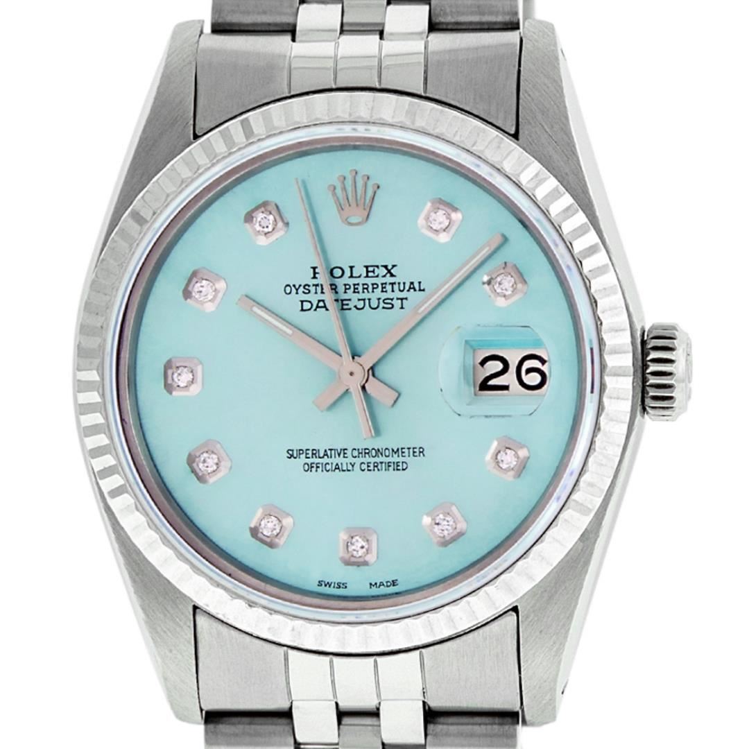 One Mens Pre Owned Stainless Steel Rolex Datejust Polished Bright with Satin Finish, This Watch Has Been Serviced And Electronically Tested, Stainless Steel Case: 36mm, Stainless Steel Crown, Rolex Bezel: White Gold Fluted Bezel. Custom Crystal: New Acrylic With Magnified Date Window. Custom Hands: New Luminescent Hands. Rolex Movement: Automatic Winding Movement 3035. Custom Dial: Custom Blue Dial With Added Diamond Hour Markers, Diamond Count: 10 Diamonds On Dial. Date Window: 3 O'Clock Position Date Display, Quickset, Model: Datejust, Condition: G-6 Extra Fine. Rolex Bracelet: Stainless Steel Jubilee Band. Bright Polish And Satin Finish. 7.0 Inch Length, Adjustable. Standard Clasp, With Rolex Logo. This Watch Has Been Serviced Time Tested And Is In Excellent Condition It Is Free Of All Scratches And Dents.