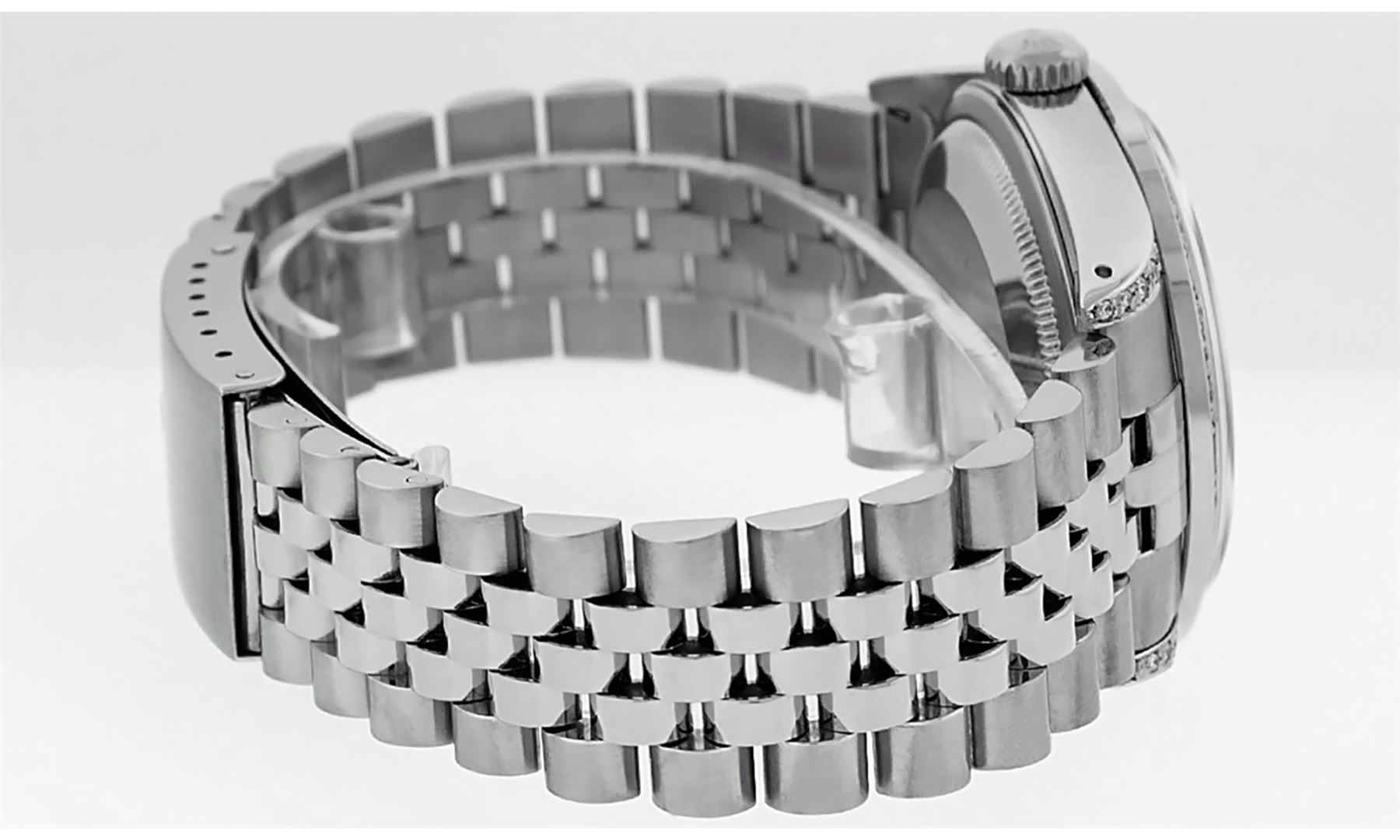 One Pre Owned Stainless Steel 36MM Rolex Datejust Polished Bright with Satin Finish, Serviced & Electronically Tested, Rolex Stainless Steel Case: 36mm, Custom Diamonds On Lugs: 28 Added Diamonds On Lugs. Custom Bezel: New 18K White Gold Pyramid Diamond Bezel, Diamond Count: 24 Diamonds On Bezel. Custom Crystal: New Sapphire With Magnified Date Window. Custom Hands: New Solid Hands. Rolex Movement: Automatic Winding Movement 3035. Custom Dial: Custom Silver With Added Diamonds, Diamond Count: 10 Diamonds On Dial. Date Window: 3 O'Clock Position Date Display, Quickset, Model: Datejust Condition: G-6 Extra Fine. Rolex Bracelet: Stainless Steel Jubilee Band. Bright Polish & Satin Finish. 7.0 Inch Length, Adjustable. Standard Clasp, With Rolex Logo. This Watch Has Been Serviced And Polished And Its Free Of All Dents And Scratches.