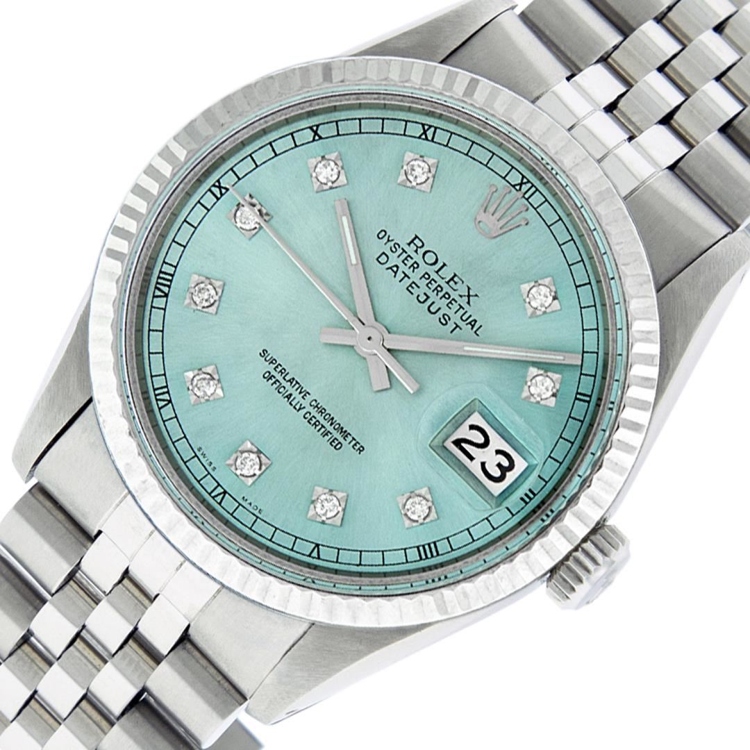One Mens Pre Owned Stainless Steel Rolex Datejust Polished Bright with Satin Finish, This Watch Has Been Serviced & Electronically Tested, Rolex Stainless Steel Case: 36mm, Rolex Stainless Steel Crown, Rolex Bezel: 14K White Gold Fluted Bezel. Custom Crystal: New Acrylic With Magnified Date Window. Custom Hands: New Luminescent Hands. Rolex Movement: Automatic Winding Movement 3035. Custom Dial: Custom Blue Dial With Added Diamond Hour Markers, 10 Diamonds On Dial. Date Window: 3 O'clock Position Date Display, Quickset, Model: Quickset Datejust, Condition: G-6 Extra Fine. Rolex Bracelet: Stainless Steel Jubilee Band. Bright Polish & Satin Finish. 7.0 Inch Length, Adjustable. Standard Clasp, With Rolex Logo. This Watch Has Been Serviced Time Tested And Is In Excellent Condition It Is Free Of All Scratches And Dents.