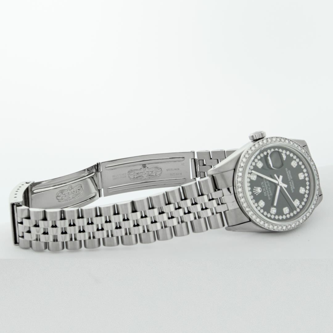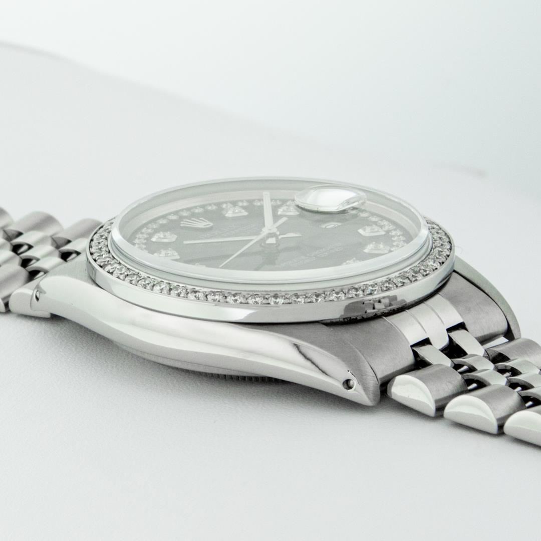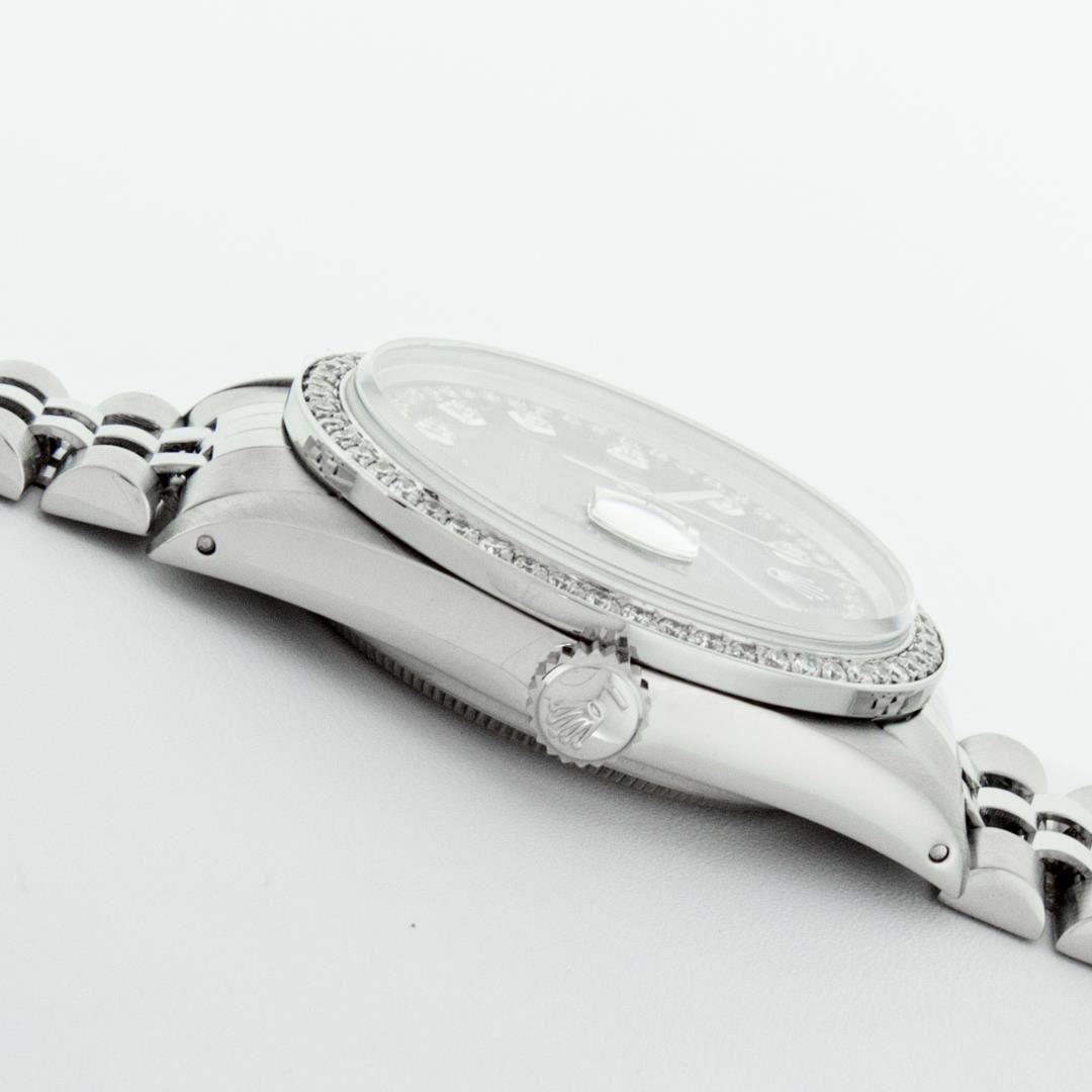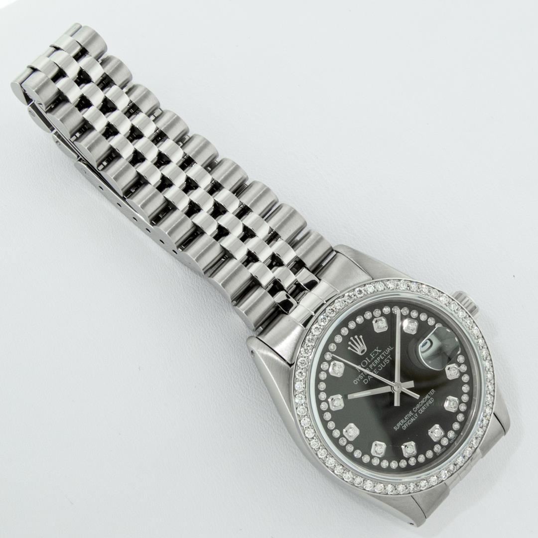 One Mens Pre Owned Rolex Stainless Steel Datejust Polished Bright with Satin Finish, Stainless Steel Case: 36mm, Stainless Steel Crown, Custom Bezel: New Stainless Steel Beadset Diamond Bezel, Diamond Count: 54 Diamonds. Custom Crystal: New Sapphire With Date Window. Custom Hands: New Luminescent Hands. Rolex Movement: Automatic Winding Movement 3035. Custom Dial: Custom Black Dial With Custom Added Diamonds, Diamond Count: 58 Diamonds In Dial. Date Window: 3 O'Clock Position Date Display, Quickset, Model: Quickset Datejust. Condition: G-6 Extra Fine. Rolex Bracelet: Stainless Steel Jubilee Band. Bright Polish And Satin Finish. 7.0 Inch Length, Adjustable. Standard Clasp, With Rolex Logo. This Watch Has Been Serviced Time Tested And Is In Excellent Condition It Is Free Of All Scratches And Dents.