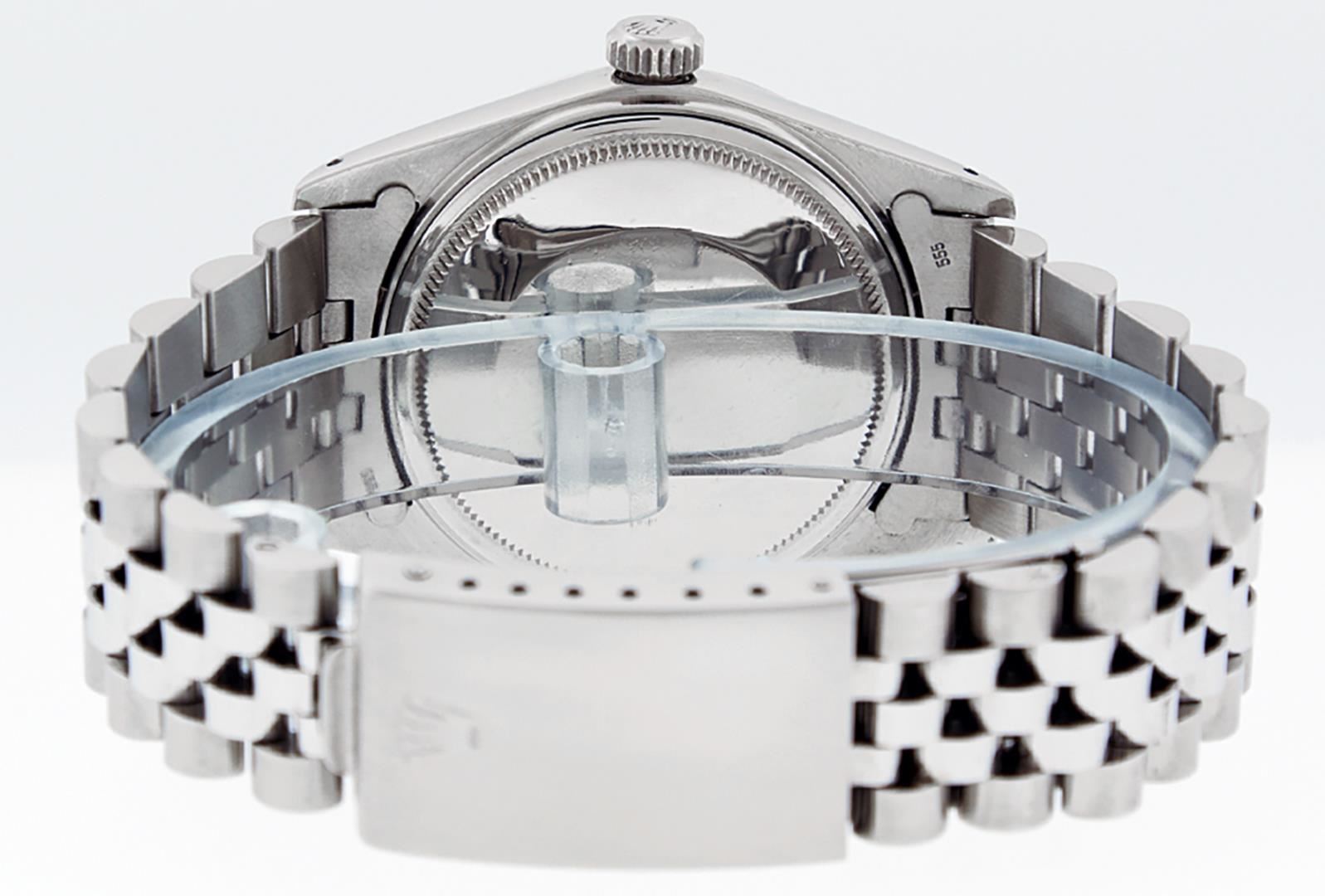 One Mens 36MM Stainless Steel Rolex Datejust Polished Bright with Satin Finish, This Watch Has Been Serviced & Electronically Tested, Rolex Stainless Steel Case: 36mm, Rolex Stainless Steel Crown, Rolex Bezel: 14K White Gold Fluted Bezel. Custom Crystal: New Acrylic With Magnified Date Window. Custom Hands: New Luminescent Hands. Rolex Movement: Automatic Winding Movement 3035. Custom Dial: Custom White Diamond Dial With Added Diamond Hour Markers, Diamond Count: 10 Diamonds On Dial. Date Window: 3 O'Clock Position Date Display, Quickset, Model: Datejust, Condition: G-6 Extra Fine. Rolex Bracelet: Stainless Steel Jubilee Band. Bright Polish & Satin Finish. 7.0 Inch Length, Adjustable. Fold Clasp, With Rolex Logo. This Watch Has Been Serviced Time Tested And Is In Excellent Condition It Is Free Of All Scratches And Dents.