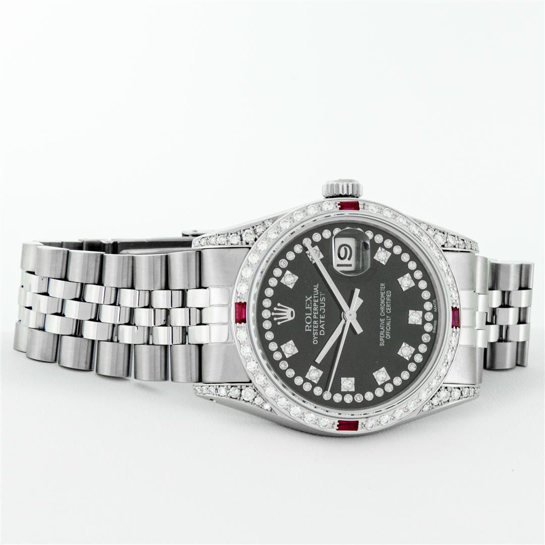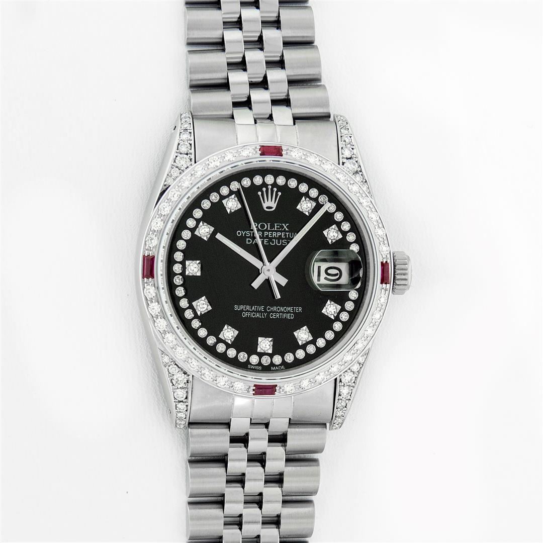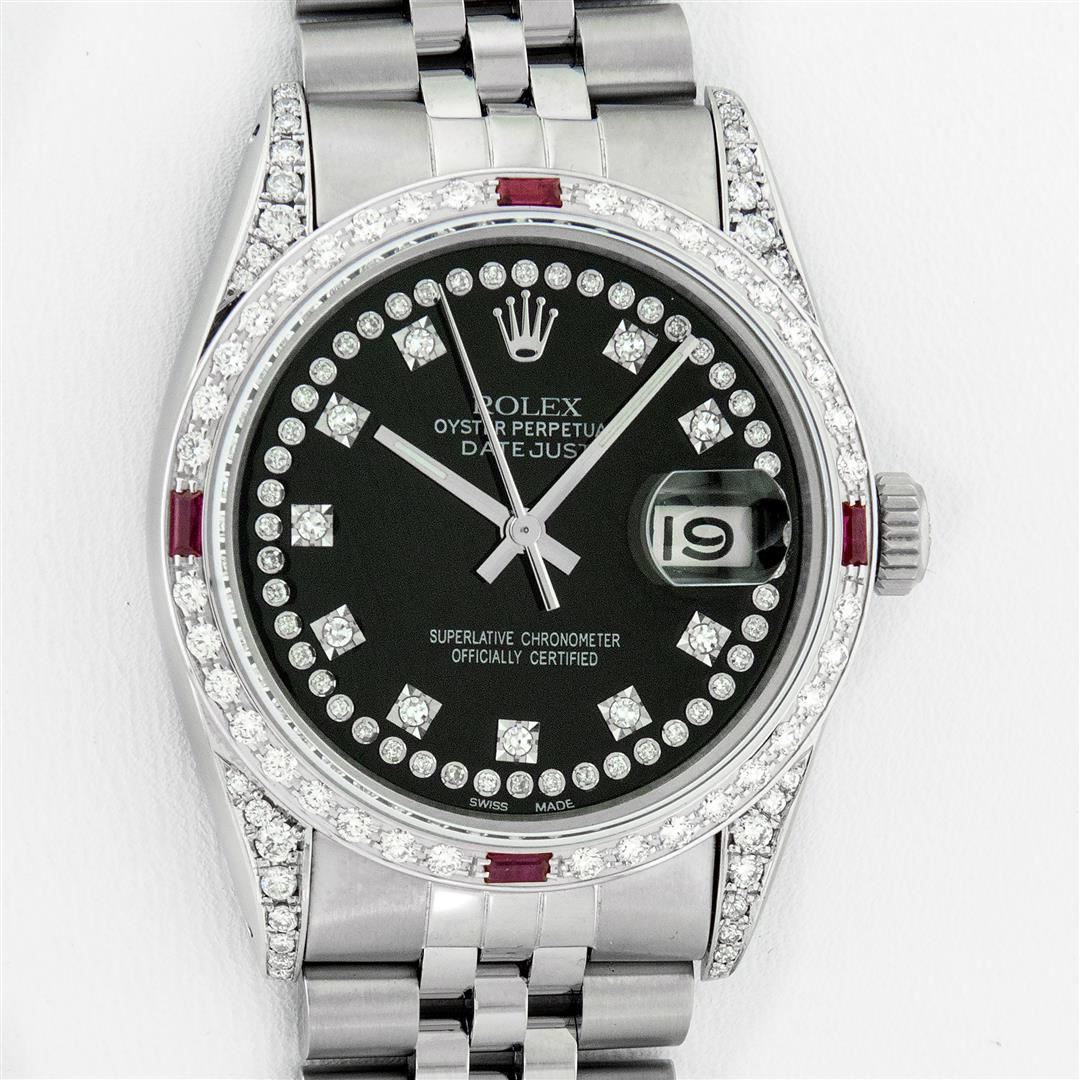 One Men's Rolex Datejust Polished Bright with Satin Finish, Serviced & Electronically Tested, Stainless Steel Case: 36mm, Custom Diamond Lugs: 28 Diamonds On Lugs, Color: G to H, Clarity: SI-VS. Stainless Steel Crown, Custom Bezel: 18K White Gold Diamond + Ruby Beadset, Diamond Count: 36 Diamonds + 4 Rubies, Total Weight 1.00 Carat, Clarity: SI-VS, Color: G to H. Custom Crystal: New Scratch Resistant Synthetic Sapphire Cyclops Lens. Custom Hands: New Luminescent Hands. Movement: Automatic Winding Movement Caliber 3035. Custom Dial: Black String Diamond Dial, Stone Count: 43 Diamonds On Dial, Diamond Color: G To H In Color, Clarity: VS. Date Window: 3 O'Clock Position Date Display, Quickset, Model: Datejust Condition: G-6 Extra Fine. Bracelet: Stainless Steel Jubilee Band. Bright Polish & Satin Finish. 7.0 Inch Length, Adjustable. Standard Clasp, With Rolex Logo. This Watch Has Been Serviced And Polished And Its Free Of All Dents And Scratches.