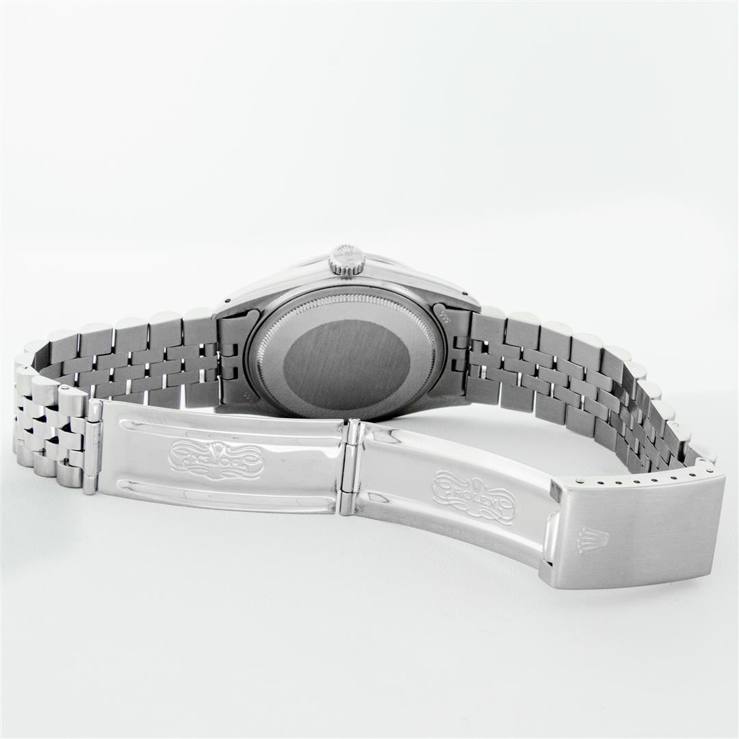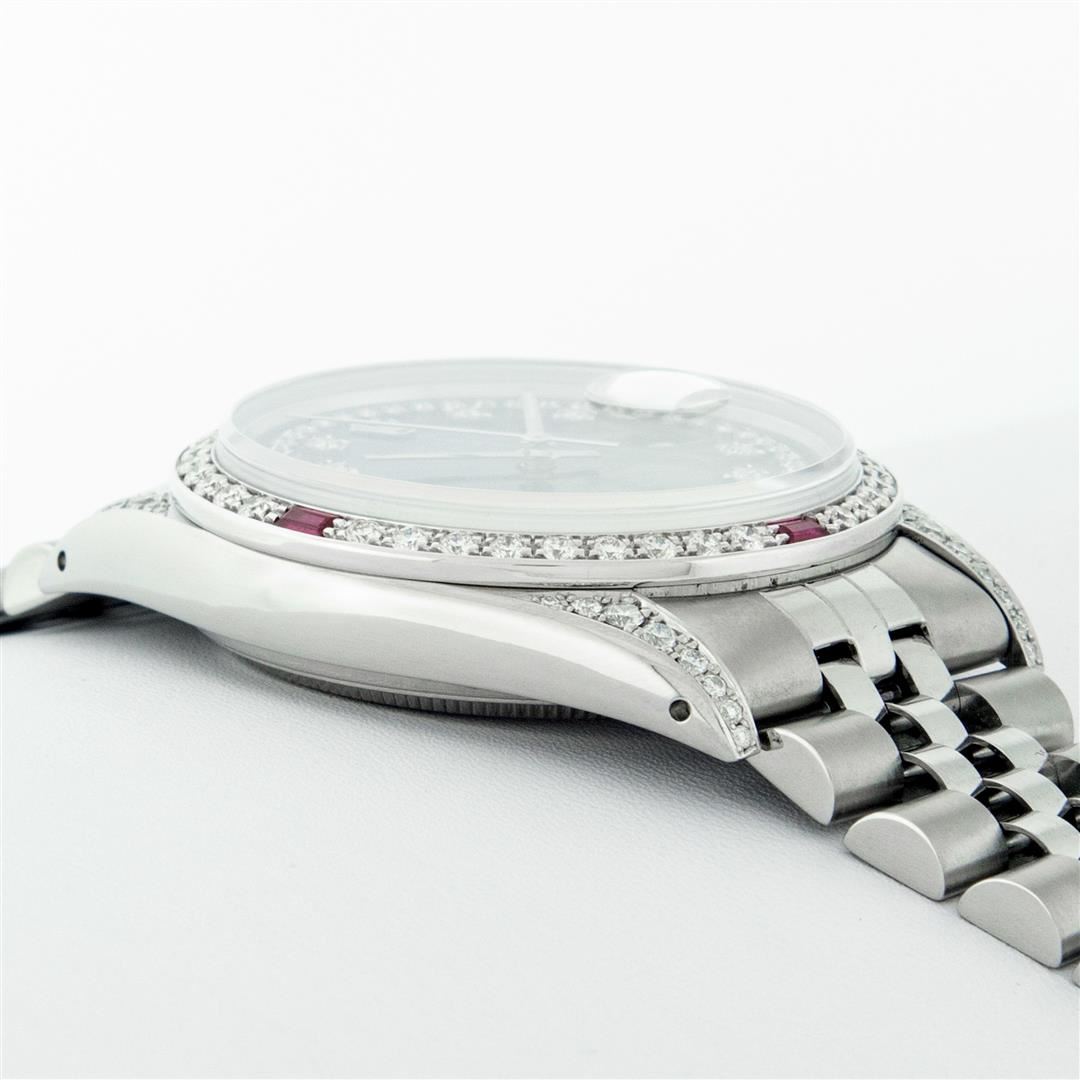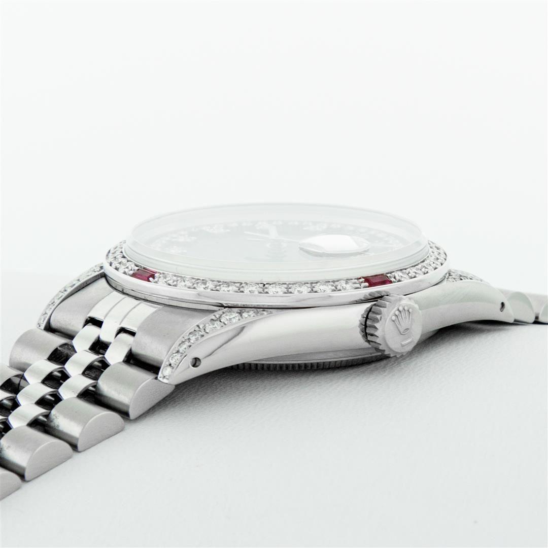 One Men's Rolex Datejust Polished Bright with Satin Finish, Serviced & Electronically Tested, Stainless Steel Case: 36mm, Custom Diamond Lugs: 28 Diamonds On Lugs, Color: G to H, Clarity: SI-VS. Stainless Steel Crown, Custom Bezel: 18K White Gold Diamond + Ruby Beadset, Diamond Count: 36 Diamonds + 4 Rubies, Total Weight 1.00 Carat, Clarity: SI-VS, Color: G to H. Custom Crystal: New Scratch Resistant Synthetic Sapphire Cyclops Lens. Custom Hands: New Luminescent Hands. Movement: Automatic Winding Movement Caliber 3035. Custom Dial: Black String Diamond Dial, Stone Count: 43 Diamonds On Dial, Diamond Color: G To H In Color, Clarity: VS. Date Window: 3 O'Clock Position Date Display, Quickset, Model: Datejust Condition: G-6 Extra Fine. Bracelet: Stainless Steel Jubilee Band. Bright Polish & Satin Finish. 7.0 Inch Length, Adjustable. Standard Clasp, With Rolex Logo. This Watch Has Been Serviced And Polished And Its Free Of All Dents And Scratches.