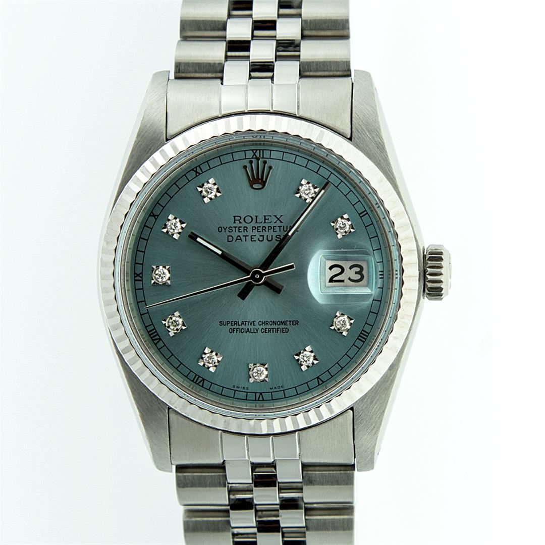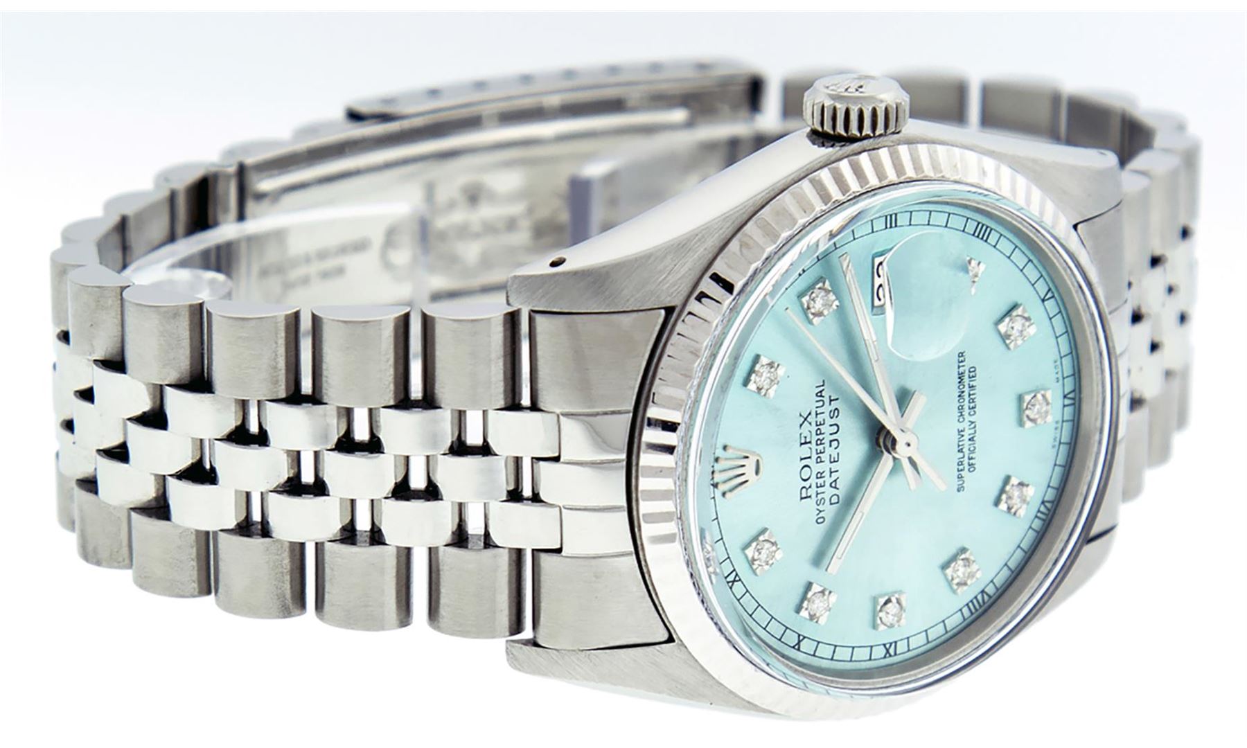One Mens Stainless Steel Rolex Datejust Polished Bright with Satin Finish, This Watch Has Been Serviced & Electronically Tested, Stainless Steel Case: 36mm, Stainless Steel Crown, Bezel: 14K White Gold Fluted Bezel. Custom Crystal: New Acrylic Cyclops Lens. Custom Hands: New Luminescent Hands. Movement: Automatic Winding Movement. Custom Dial: Ice Blue Dial With Diamond Hour Markers and Roman Track, 10 Diamonds On Dial G To H In Color, SI-VS Clarity. Date Window: 3 O'Clock Position Date Display, Quickset, Model: Datejust, Condition: G-6 Extra Fine. Bracelet: Stainless Steel Jubilee. Bright Polish & Satin Finish. 7.0 Inch Length, Adjustable. Standard Clasp, With Rolex Logo. This Watch Has Been Serviced Time Tested And Is In Excellent Condition It Is Free Of All Scratches And Dents.