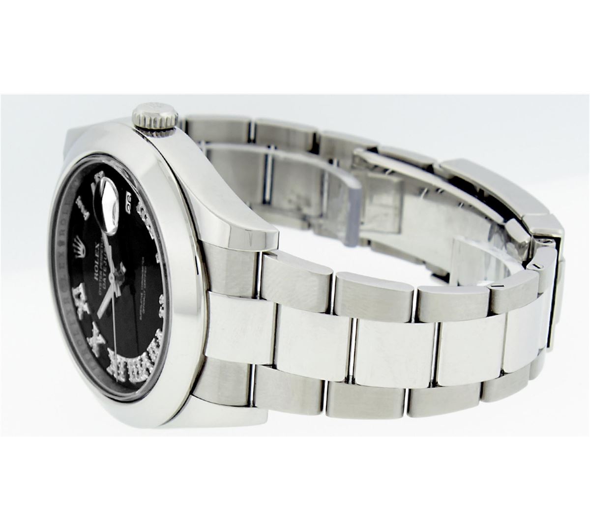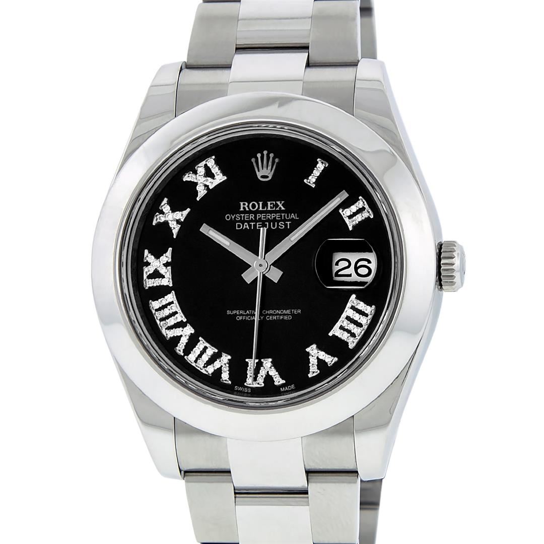 One Mens Rolex Datejust 2 Polished With Shiny Finish, Serviced & Electronically Tested, Stainless Steel Case:41mm, Stainless Steel Crown, Bezel: Stainless Steel Smooth Bezel, . Crystal: Synthetic Sapphire Cyclops Lens. Movement: Automatic Winding Movement Caliber 3136. Custom Dial: Black Roman Diamond Dial, Diamond Color: G To H, Clarity: SI-VS. Date Window: 3 O'Clock Position Date Display, Quickset, Model: 116300 Datejust 2. Condition: G-6 Extra Fine The Watch Is In Very Good Condition Free Of All Scratches And Dents. Bracelet:Stainless Steel Oyster Band. Bright Polish & Satin Finish. 7.5 Inch Length, Adjustable. Standard Clasp, With Rolex Logo.