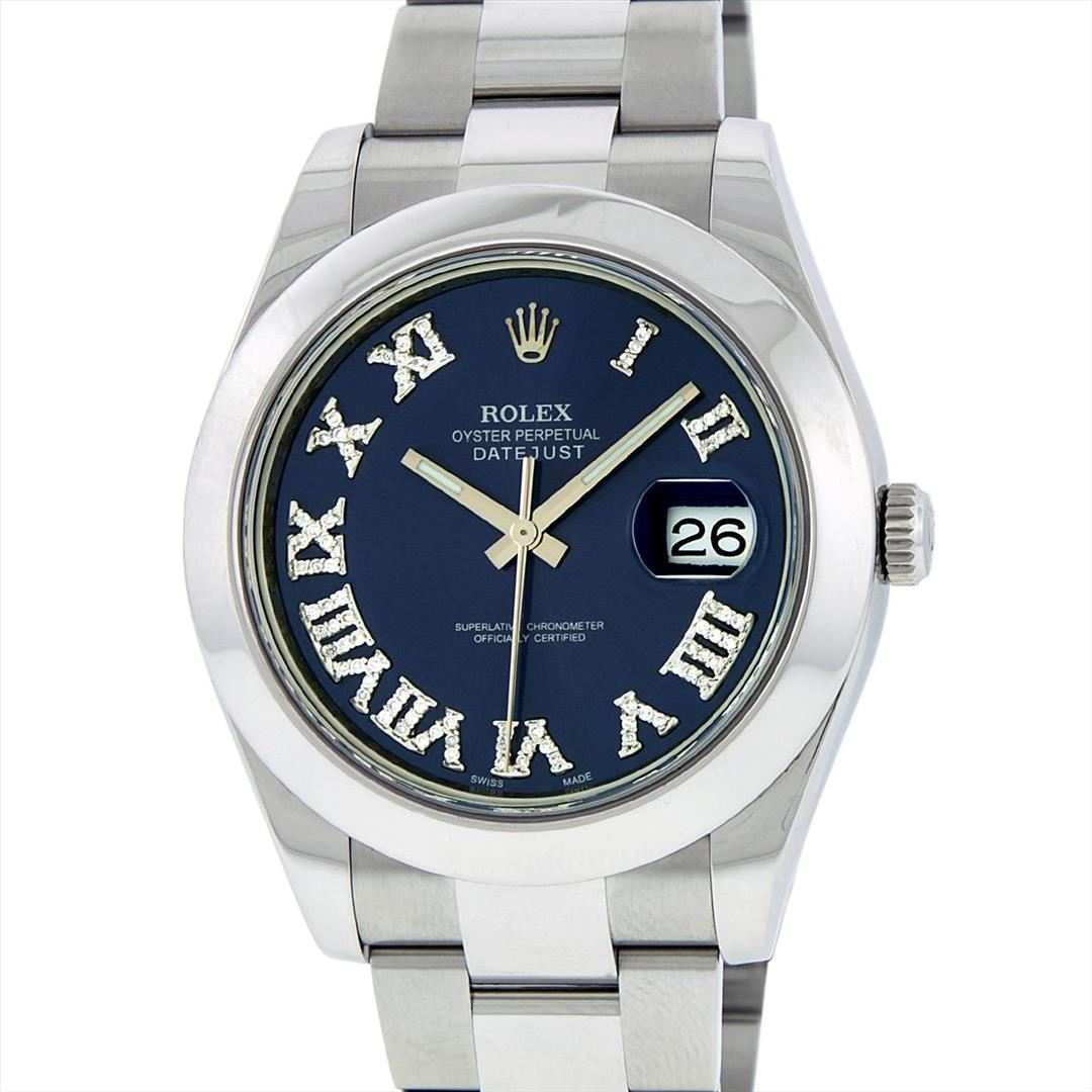 One Mens Rolex Datejust 2 Polished With Shiny Finish, Serviced & Electronically Tested, Stainless Steel Case:41mm, Stainless Steel Crown, Bezel: Stainless Steel Smooth Bezel, . Crystal: Synthetic Sapphire Cyclops Lens. Movement: Automatic Winding Movement Caliber 3136. Custom Dial: Blue Roman Diamond Dial, Diamond Color: G To H, Clarity: SI-VS. Date Window: 3 O'Clock Position Date Display, Quickset, Model: 116300 Datejust 2. Condition: G-6 Extra Fine The Watch Is In Very Good Condition Free Of All Scratches And Dents. Bracelet:Stainless Steel Oyster Band. Bright Polish & Satin Finish. 7.5 Inch Length, Adjustable. Standard Clasp, With Rolex Logo.
