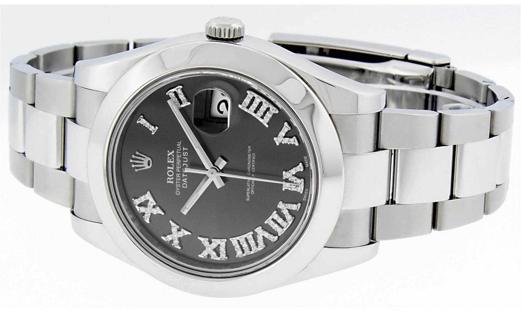 One Mens Rolex Datejust 2 Polished Bright with Shiny Finish, Serviced & Electronically Tested, Stainless Steel Case:41mm, Stainless Steel Crown, Bezel: Stainless Steel Smooth Bezel, . Crystal: Synthetic Sapphire Cyclops Lens. Movement: Automatic Winding Movement Caliber 3136. Custom Dial: Dark Slate Roman Diamond Dial, Diamond Color: G To H, Clarity: SI-VS. Date Window: 3 O'Clock Position Date Display, Quickset, Model: 116300 Datejust 2. Condition: G-6 Extra Fine The Watch Is In Very Good Condition Free Of All Scratches And Dents. Bracelet: Stainless Steel Oyster Band. Bright Polish & Satin Finish. 7.5 Inch Length, Adjustable. Standard Clasp, With Rolex Logo.