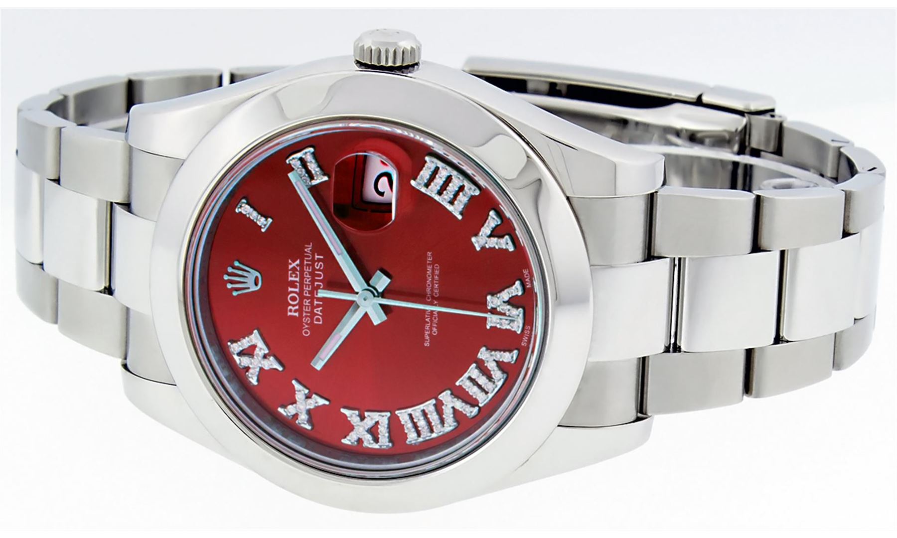 One Mens Rolex Datejust 2 Polished Bright with Shiny Finish, Serviced & Electronically Tested, Stainless Steel Case:41mm, Stainless Steel Crown, Bezel: Stainless Steel Smooth Bezel, . Crystal: Synthetic Sapphire Cyclops Lens. Movement: Automatic Winding Movement Caliber 3136. Custom Dial: Red Roman Diamond Dial, Diamond Color: G To H, Clarity: SI-VS. Date Window: 3 O'Clock Position Date Display, Quickset, Model: 116300 Datejust 2. Condition: G-6 Extra Fine The Watch Is In Very Good Condition Free Of All Scratches And Dents. Bracelet: Stainless Steel Oyster Band. Bright Polish & Satin Finish. 7.5 Inch Length, Adjustable. Standard Clasp, With Rolex Logo.