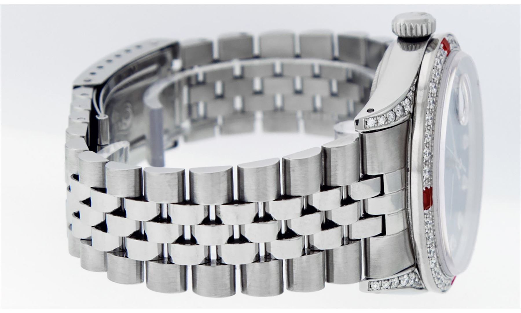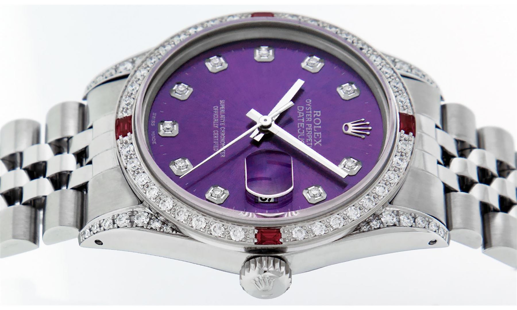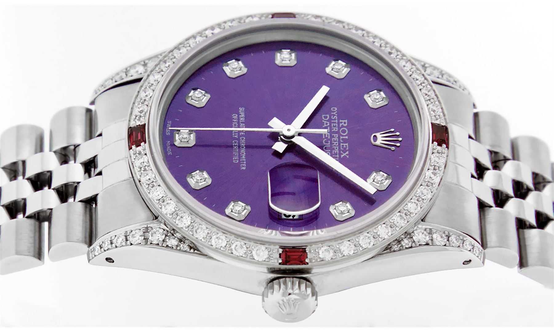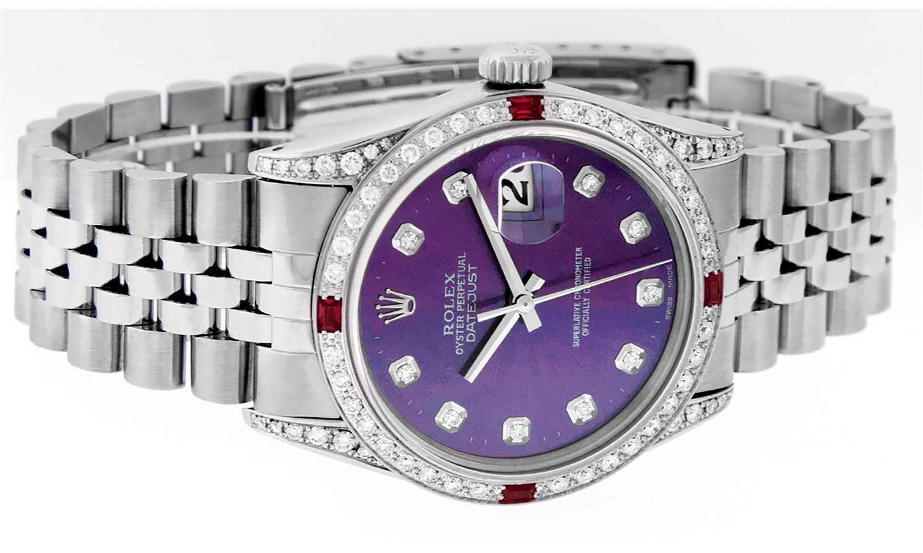 One Mens Rolex Datejust Polished Bright with Satin Finish, Serviced & Electronically Tested, Stainless Steel Case: 36mm, Custom Diamond Lugs: 28 Diamonds In Lugs, Color: G to H, Clarity: SI-VS. Stainless Steel Crown, Custom Bezel: 18K White Gold Diamond + Ruby Beadset, Diamond Count: 36 Diamonds + 4 Rubies, Total Weight 1.00 Carat, Clarity: SI-VS, Color: G to H. Custom Crystal: New Scratch Resistant Synthetic Sapphire Cyclops Lens. Custom Hands: New Luminescent Hands. Movement: Automatic Winding Movement Caliber 3035. Custom Dial: Purple Single Cut Diamond Dial With Dash Track, Stone Count: 10 Diamonds In Dial, Diamond Color: G To H In Color, Clarity: VS. Date Window: 3 O'Clock Position Date Display, Quickset, Model: Datejust Condition: G-6 Extra Fine. Bracelet: Stainless Steel Jubilee Band. Bright Polish & Satin Finish. 7.0 Inch Length, Adjustable. Standard Clasp, With Rolex Logo. This Watch Has Been Serviced And Polished And Its Free Of All Dents And Scratches.