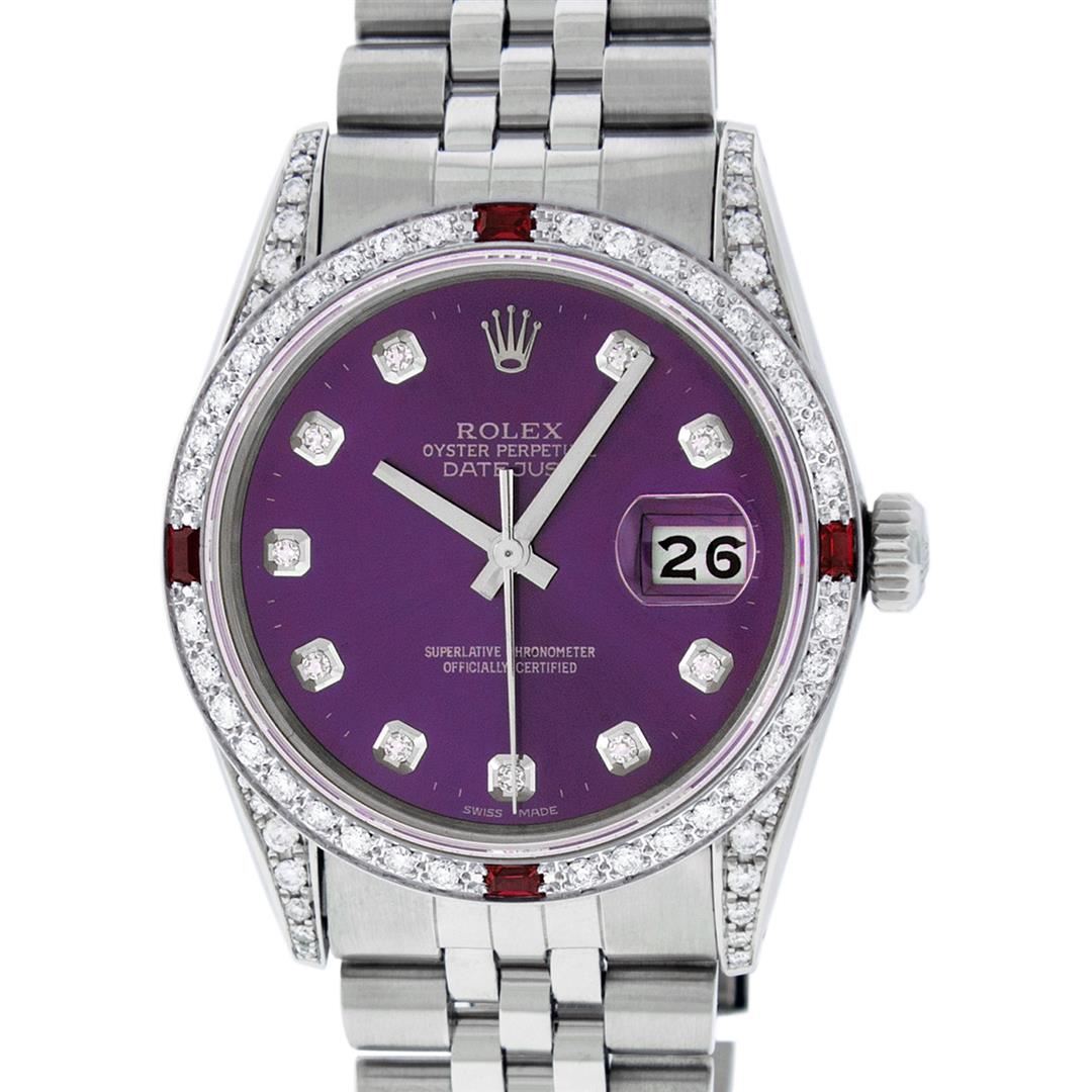 One Mens Rolex Datejust Polished Bright with Satin Finish, Serviced & Electronically Tested, Stainless Steel Case: 36mm, Custom Diamond Lugs: 28 Diamonds In Lugs, Color: G to H, Clarity: SI-VS. Stainless Steel Crown, Custom Bezel: 18K White Gold Diamond + Ruby Beadset, Diamond Count: 36 Diamonds + 4 Rubies, Total Weight 1.00 Carat, Clarity: SI-VS, Color: G to H. Custom Crystal: New Scratch Resistant Synthetic Sapphire Cyclops Lens. Custom Hands: New Luminescent Hands. Movement: Automatic Winding Movement Caliber 3035. Custom Dial: Purple Single Cut Diamond Dial With Dash Track, Stone Count: 10 Diamonds In Dial, Diamond Color: G To H In Color, Clarity: VS. Date Window: 3 O'Clock Position Date Display, Quickset, Model: Datejust Condition: G-6 Extra Fine. Bracelet: Stainless Steel Jubilee Band. Bright Polish & Satin Finish. 7.0 Inch Length, Adjustable. Standard Clasp, With Rolex Logo. This Watch Has Been Serviced And Polished And Its Free Of All Dents And Scratches.