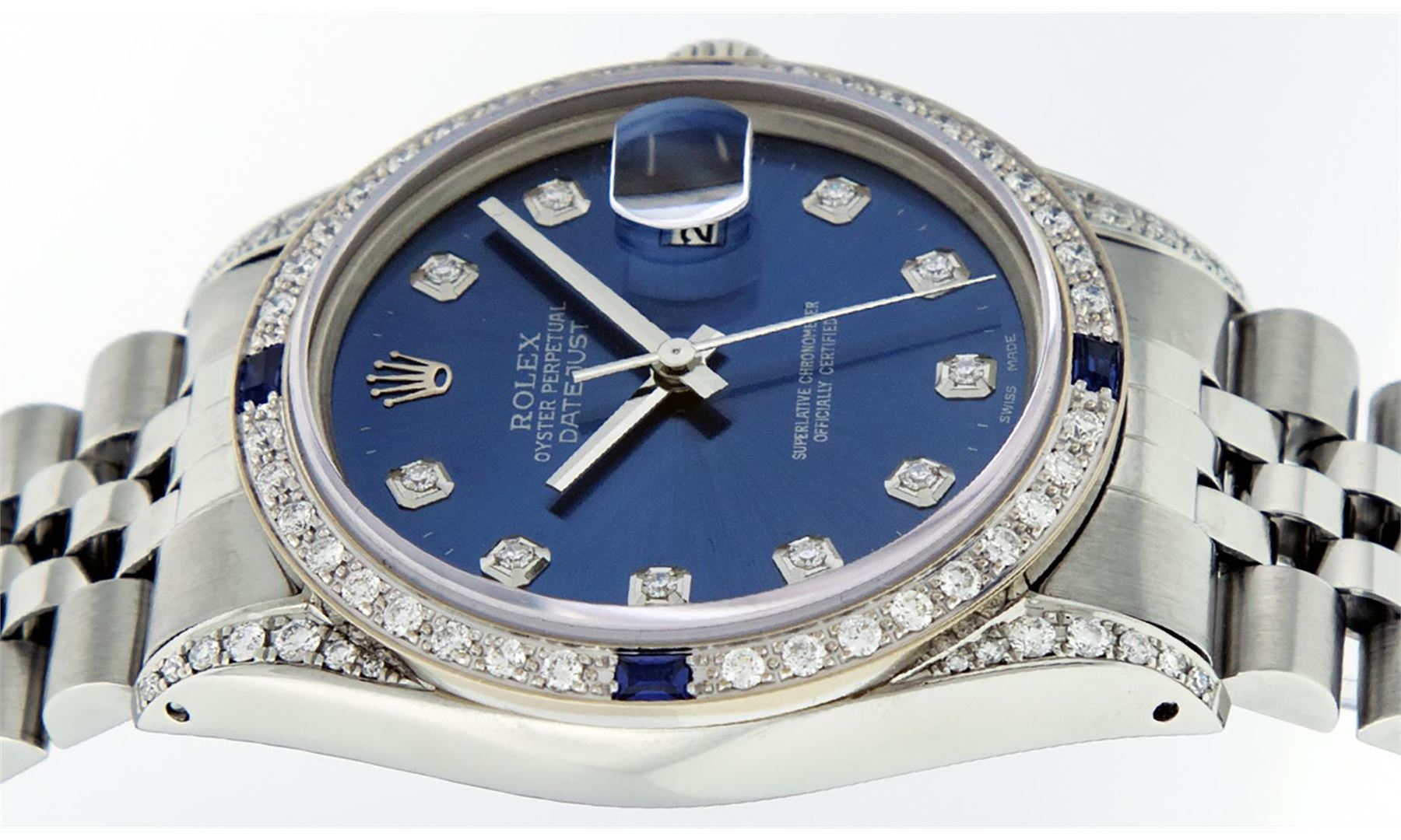 One Mens Rolex Datejust Polished Bright with Satin Finish, Serviced & Electronically Tested, Stainless Steel Case: 36mm, Custom Diamond Lugs: 28 Diamonds In Lugs, Color: G to H, Clarity: SI-VS. Stainless Steel Crown, Custom Bezel: 18K White Gold Diamond + Sapphire Beadset, Diamond Count: 36 Diamonds + 4 Sapphires, Total Weight 1.00 Carat, Clarity: SI-VS, Color: G to H. Custom Crystal: New Scratch Resistant Synthetic Sapphire Cyclops Lens. Custom Hands: New Luminescent Hands. Movement: Automatic Winding Movement Caliber 3035. Custom Dial: Blue Diamond Dial With Dash Track, Stone Count: 10 Diamonds, Diamond Color: G To H In Color, Clarity: SI-VS. Date Window: 3 O'Clock Position Date Display, Quickset, Model: Datejust Condition: G-6 Extra Fine. Bracelet: Stainless Steel Jubilee Band. Bright Polish & Satin Finish. 7.0 Inch Length, Adjustable. Standard Clasp, With Rolex Logo. This Watch Has Been Serviced And Polished And Its Free Of All Dents And Scratches.