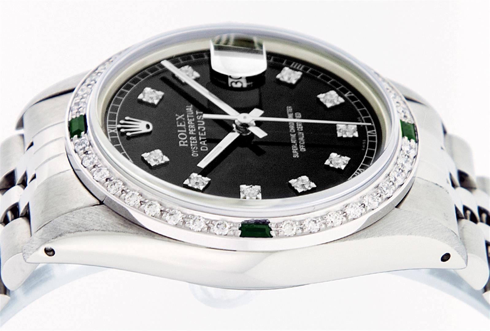 One Mens Rolex Datejust Polished, Serviced & Electronically Tested, Stainless Steel Case:36mm, Stainless Steel Crown, Custom Bezel: 18K White Gold Emerald Beadset Diamond Bezel, Diamond + Gem Count: 36 Diamonds + 4 Emeralds. Total Weight 1.00 Carat, Clarity: SI-VS, Color: G to H. Custom Crystal: Synthetic Sapphire Cyclops Lens. Movement: Automatic Winding Movement Caliber 3035. Custom Dial: Black With Diamond Hour Markers Square Roman Track, Diamond Count: 10 Diamonds In Dial Square Setting. G To H In Color, Clarity: SI-VS. Date Window: 3 O'Clock Position Date Display, Quickset, Model: Datejust. Condition: G-6 Extra Fine. Bracelet: Stainless Steel Jubilee. Bright Polish & Satin Finish. 7.0 Inch Length, Adjustable. Standard Clasp, With Rolex Logo.