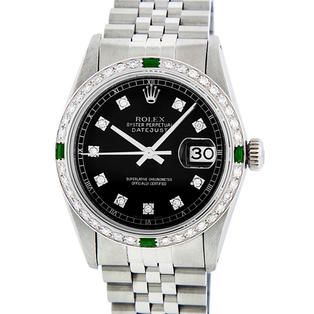 One Mens Rolex Datejust Polished, Serviced & Electronically Tested, Stainless Steel Case:36mm, Stainless Steel Crown, Custom Bezel: 18K White Gold Emerald Beadset Diamond Bezel, Diamond + Gem Count: 36 Diamonds + 4 Emeralds. Total Weight 1.00 Carat, Clarity: SI-VS, Color: G to H. Custom Crystal: Synthetic Sapphire Cyclops Lens. Movement: Automatic Winding Movement Caliber 3035. Custom Dial: Black With Diamond Hour Markers Square Roman Track, Diamond Count: 10 Diamonds In Dial Square Setting. G To H In Color, Clarity: SI-VS. Date Window: 3 O'Clock Position Date Display, Quickset, Model: Datejust. Condition: G-6 Extra Fine. Bracelet: Stainless Steel Jubilee. Bright Polish & Satin Finish. 7.0 Inch Length, Adjustable. Standard Clasp, With Rolex Logo.
