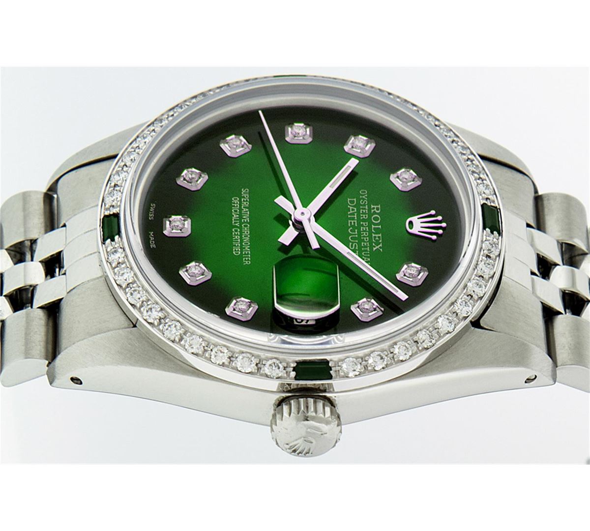 One Mens Rolex Datejust Polished, Serviced & Electronically Tested, Stainless Steel Case:36mm, Stainless Steel Crown, Custom Bezel: 18K White Gold Emerald Beadset Diamond Bezel, Diamond + Gem Count: 36 Diamonds + 4 Emeralds Total Weight 1.00 Carat, Clarity: SI-VS, Color: G to H. Custom Crystal: Synthetic Sapphire Cyclops Lens. Movement: Automatic Winding Movement Caliber 3035. Custom Dial: Green Vignette With Diamond Hour Markers, 10 Diamond Dial G To H In Color, Clarity: SI-VS. Date Window: 3 O'Clock Position Date Display, Quickset, Model: Datejust. Condition: G-6 Extra Fine. Bracelet: Stainless Steel Jubilee. Bright Polish & Satin Finish. 7.0 Inch Length, Adjustable. Standard Clasp, With Rolex Logo