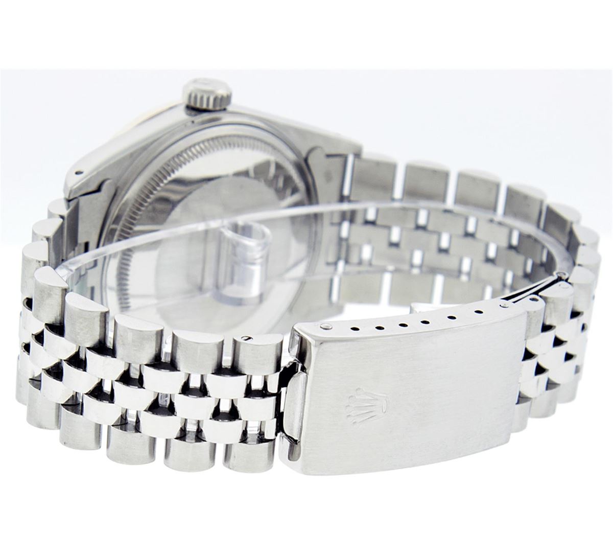 One Mens Rolex Datejust Polished, Serviced & Electronically Tested, Stainless Steel Case:36mm, Stainless Steel Crown, Custom Bezel: 18K White Gold Emerald Beadset Diamond Bezel, Diamond + Gem Count: 36 Diamonds + 4 Emeralds Total Weight 1.00 Carat, Clarity: SI-VS, Color: G to H. Custom Crystal: Synthetic Sapphire Cyclops Lens. Movement: Automatic Winding Movement Caliber 3035. Custom Dial: Slate Grey With Diamond Hour Markers, 10 Diamond Dial G To H In Color, Clarity: SI-VS. Date Window: 3 O'Clock Position Date Display, Quickset, Model: Datejust, Condition: G-6 Extra Fine. Bracelet: Stainless Steel Jubilee. Bright Polish & Satin Finish. 7.0 Inch Length, Adjustable. Standard Clasp, With Rolex Logo.