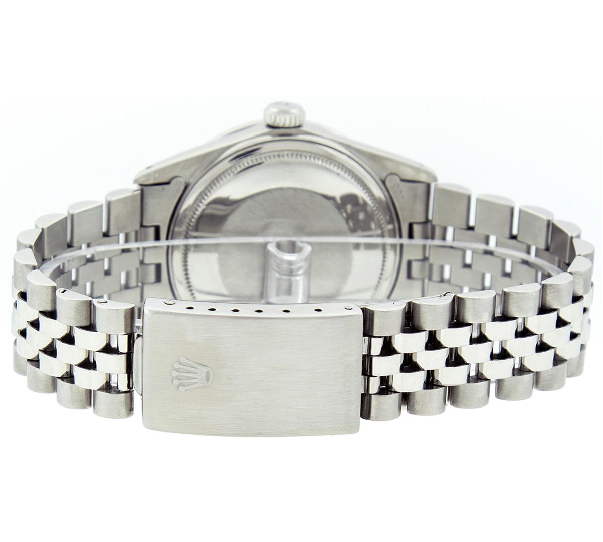 One Mens Rolex Datejust Polished Bright with Satin Finish, Serviced & Electronically Tested, Stainless Steel Case:36mm, Stainless Steel Crown, Custom Bezel: 18K White Gold Emerald Beadset Diamond Bezel, Diamond + Gem Count: 36 Diamonds + 4 Emeralds. Total Weight 1.00 Carat, Clarity: Si-VS, Color: G to H. Custom Crystal: Synthetic Sapphire Cyclops Lens. Movement: Automatic Winding Movement Caliber 3035. Custom Dial: White Diamond Dial With Square Roman Track, Diamond Count: 10 Diamonds Square Setting, Color: G to H, Clarity: SI-VS. Date Window: 3 O'Clock Position Date Display, Quickset, Model: Datejust. Condition: G-6 Extra Fine. Bracelet: Stainless Steel Jubilee. Bright Polish & Satin Finish. 7.0 Inch Length, Adjustable. Standard Clasp, With Rolex Logo.