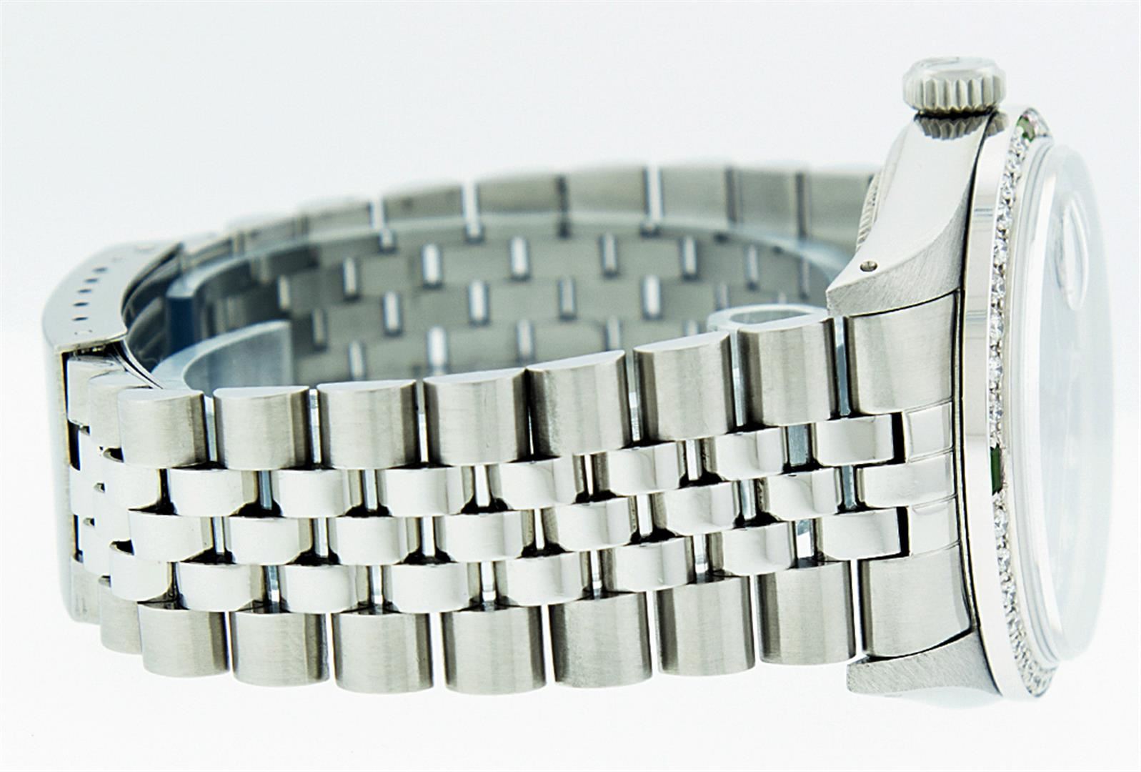 One Gents Rolex Datejust Polished, Serviced & Electronically Tested, Stainless Steel Case:36mm, Stainless Steel Crown, Custom Bezel: 18K White Gold Emerald Beadset Diamond Bezel, Diamond + Gem Count: 36 Diamonds + 4 Emeralds Total Weight 1.00 Carat, Clarity: SI-VS, Color: G to H. Custom Crystal: Synthetic Sapphire Cyclops Lens. Movement: Automatic Winding Movement Caliber 3035. Custom Dial: Green With Diamond Hour Markers, 10 Diamond Dial G To H In Color, Clarity: SI-VS. Date Window: 3 O'Clock Position Date Display, Quickset, Model: Datejust, Condition: G-6 Extra Fine. Bracelet: Stainless Steel Jubilee. Bright Polish & Satin Finish. 7.0 Inch Length, Adjustable. Standard Clasp, With Rolex Logo