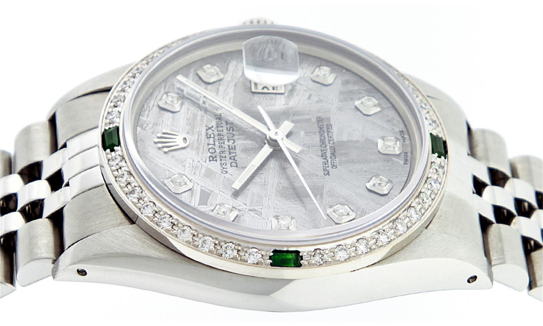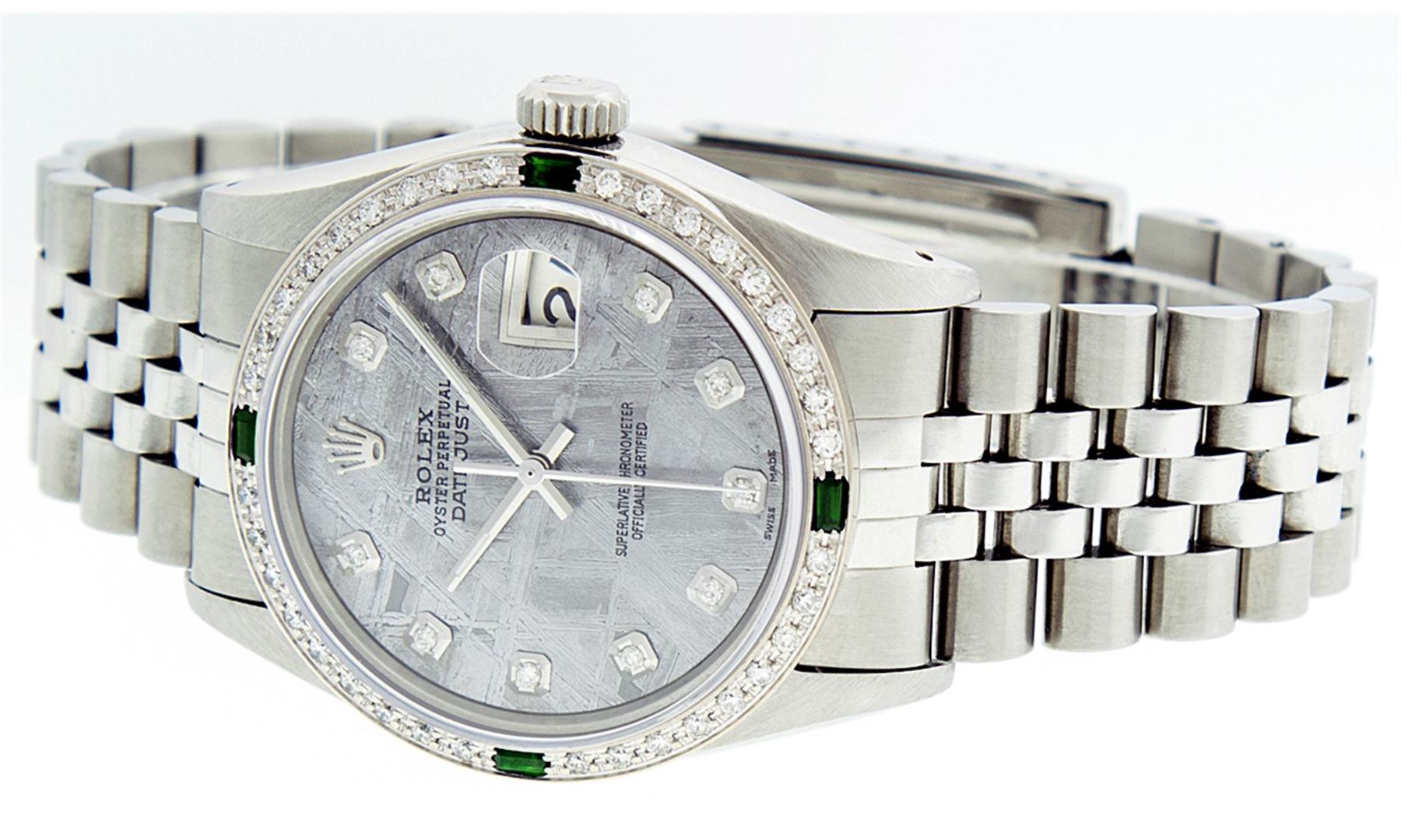 One Mens Stainless Steel Rolex Datejust Polished Bright with Satin Finish, Fully Serviced & Electronically Tested, Stainless Steel Case:36mm, Stainless Steel Crown, Custom Bezel: 18K White Gold Emerald Beadset Diamond Bezel, Diamond Count: 36 Diamonds + 4 Emeralds, Total Weight 1.00 Carat, Clarity: SI-VS, Color: G to H. Custom Crystal: Synthetic Sapphire Cyclops Lens. Movement: Automatic Winding Movement Caliber 3035. Custom Dial: Meteorite Diamond Dial, 10 Diamonds in Dial, G To H In Color, Clarity: SI-VS. Date Window: 3 O'Clock Position Date Display, Quickset, Model: Datejust, Condition: G-6 Extra Fine. Bracelet: Stainless Steel Jubilee. Bright Polish & Satin Finish. 7.0 Inch Length, Adjustable. Standard Clasp, With Rolex Logo.