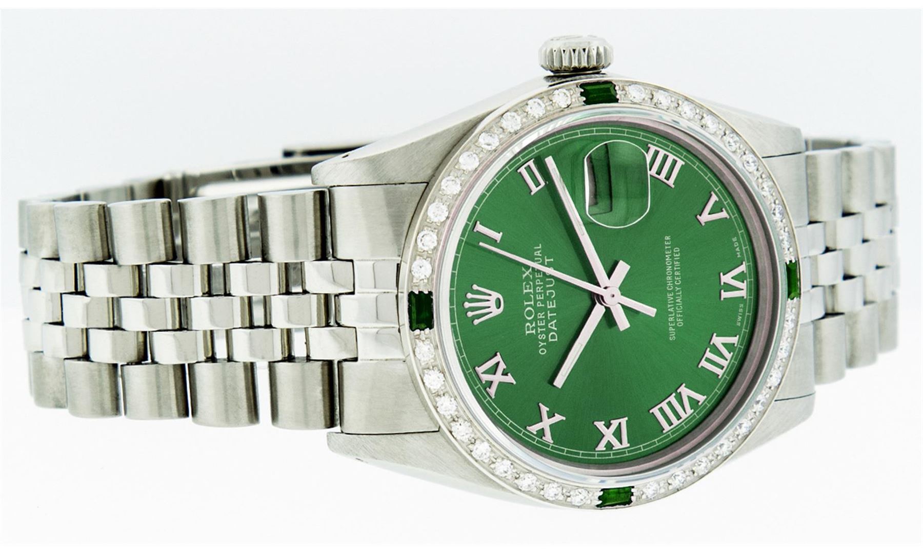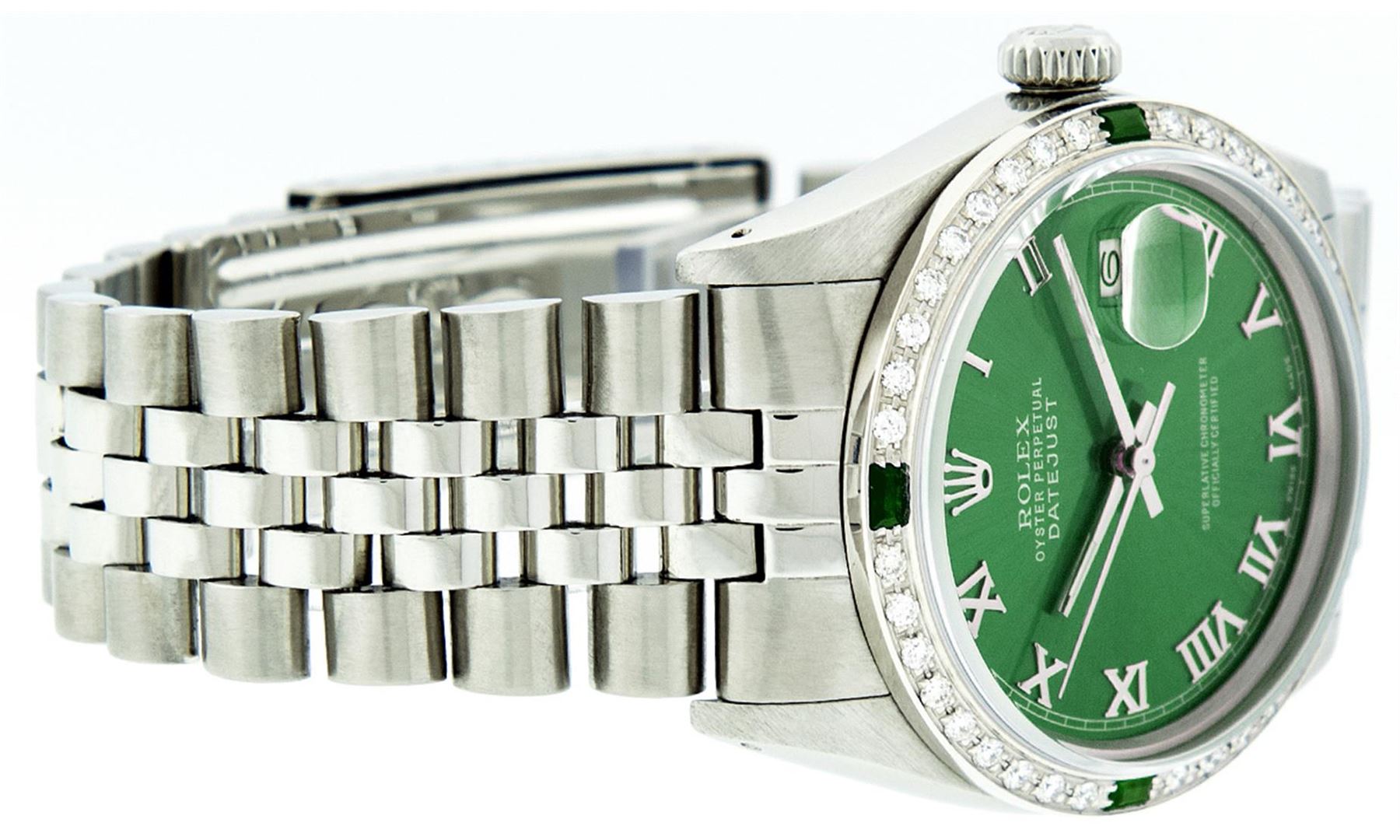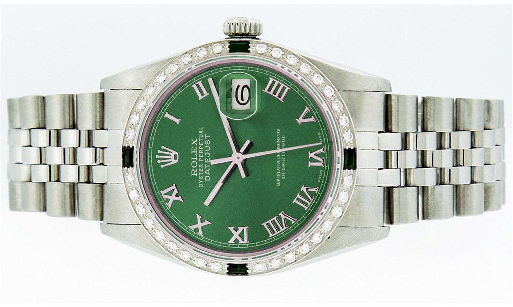 One Mens Rolex Datejust Polished Bright with Satin Finish, Serviced & Electronically Tested, Stainless Steel Case:36mm, Stainless Steel Crown, Custom Bezel: 18K White Gold Emerald Beadset Diamond Bezel, Diamond + Gem Count: 36 Diamonds + 4 Emeralds. Total Weight 1.00 Carat, Clarity: Si-VS, Color: G to H. Custom Crystal: Synthetic Sapphire Cyclops Lens. Movement: Automatic Winding Movement Caliber 3035. Custom Dial: Green Roman Dial With Square Track. Date Window: 3 O'Clock Position Date Display, Quickset, Model: Datejust. Condition: G-6 Extra Fine. Bracelet: Stainless Steel Jubilee. Bright Polish & Satin Finish. 7.0 Inch Length, Adjustable. Standard Clasp, With Rolex Logo.