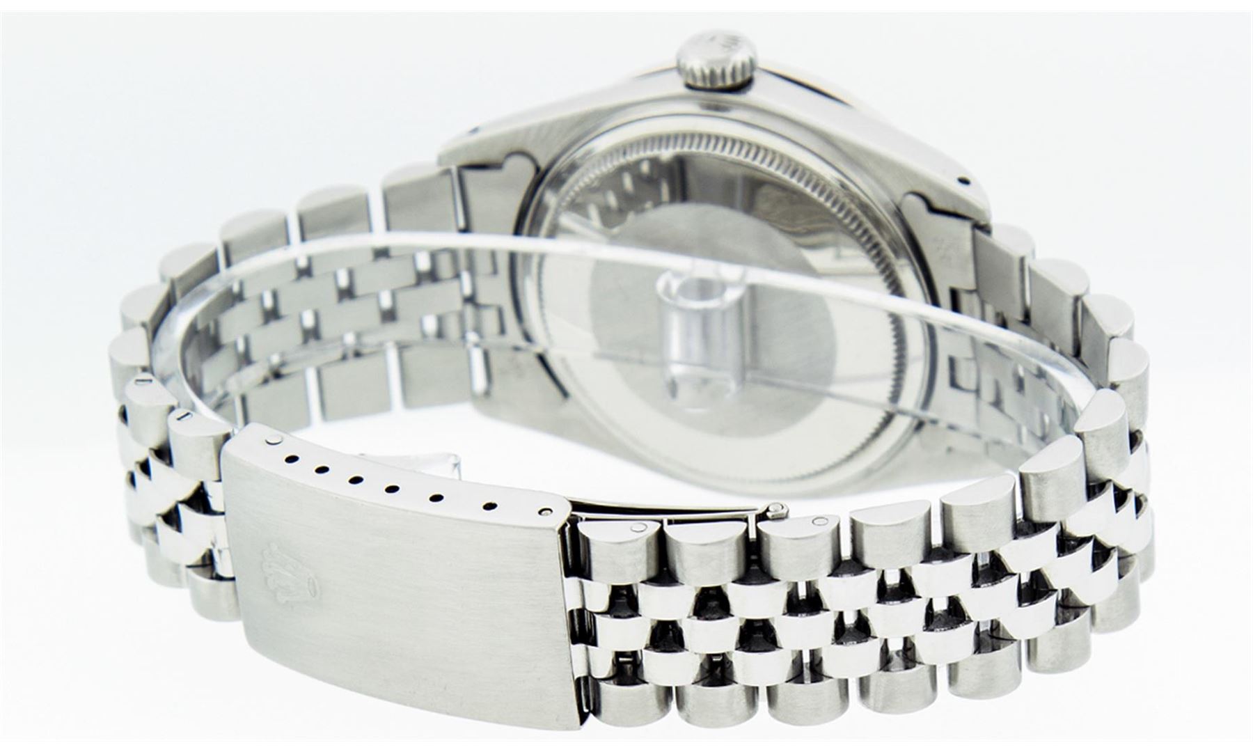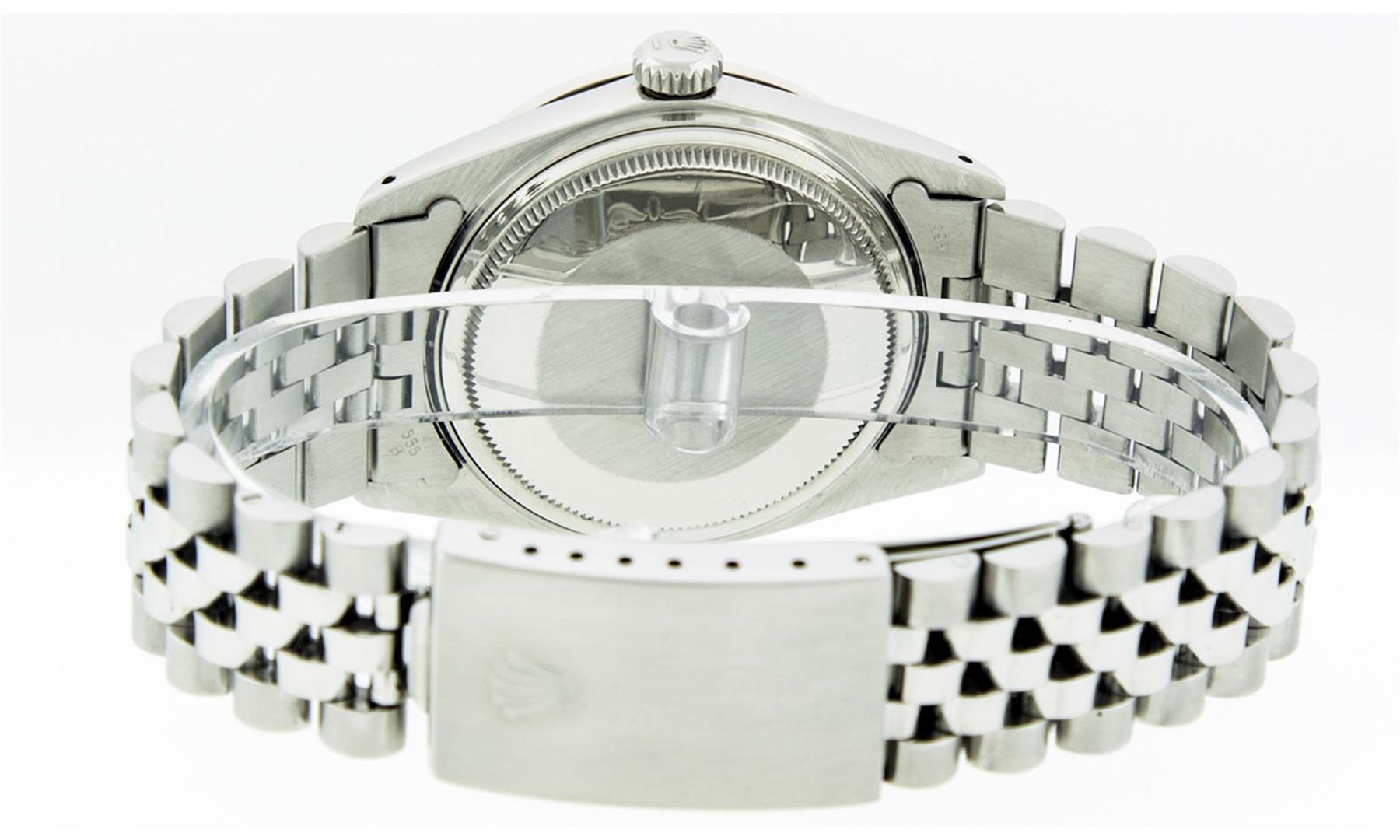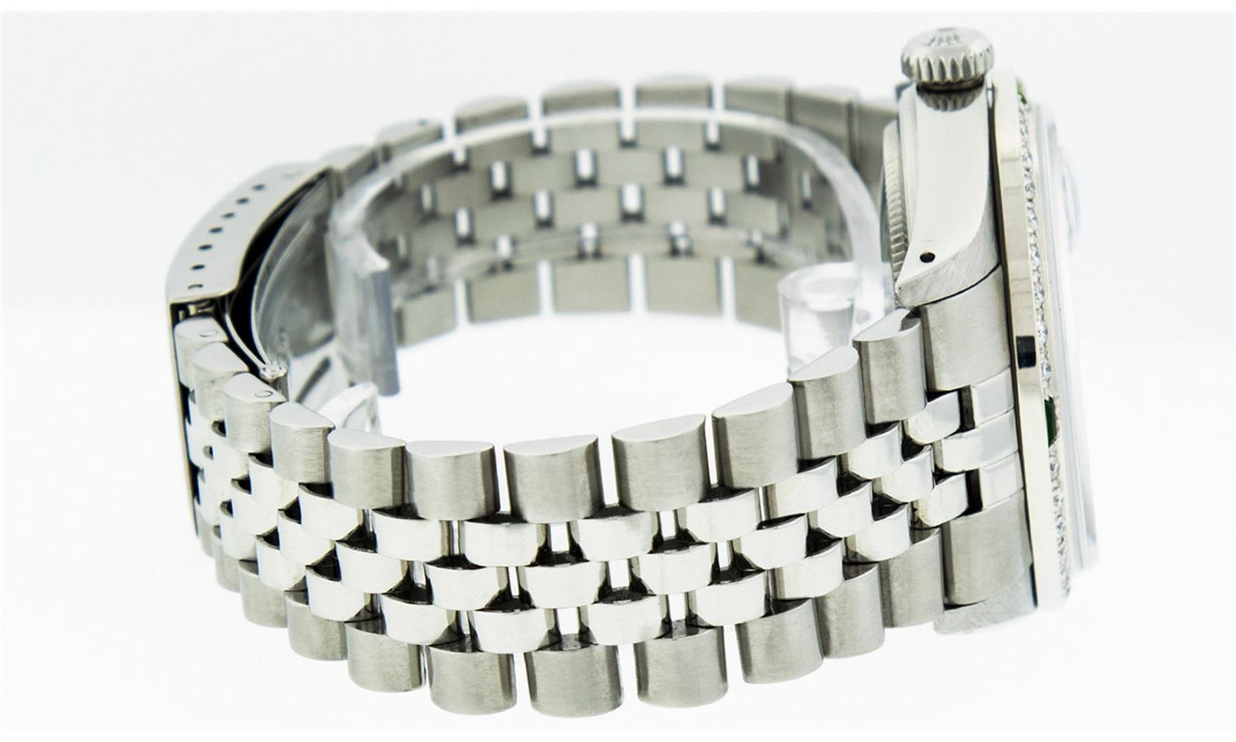 One Mens Rolex Datejust Polished Bright with Satin Finish, Serviced & Electronically Tested, Stainless Steel Case:36mm, Stainless Steel Crown, Custom Bezel: 18K White Gold Emerald Beadset Diamond Bezel, Diamond + Gem Count: 36 Diamonds + 4 Emeralds. Total Weight 1.00 Carat, Clarity: Si-VS, Color: G to H. Custom Crystal: Synthetic Sapphire Cyclops Lens. Movement: Automatic Winding Movement Caliber 3035. Custom Dial: Green Roman Dial With Square Track. Date Window: 3 O'Clock Position Date Display, Quickset, Model: Datejust. Condition: G-6 Extra Fine. Bracelet: Stainless Steel Jubilee. Bright Polish & Satin Finish. 7.0 Inch Length, Adjustable. Standard Clasp, With Rolex Logo.