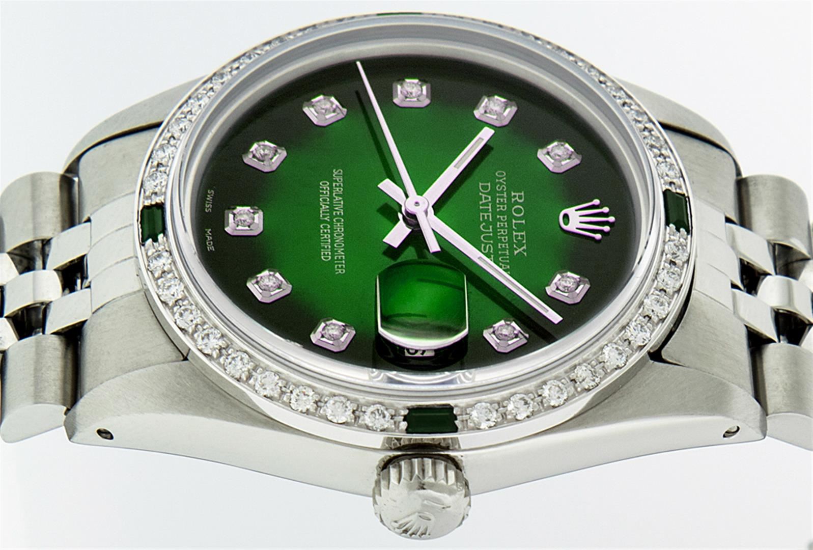One Mens Rolex Datejust Polished, Serviced & Electronically Tested, Stainless Steel Case:36mm, Stainless Steel Crown, Custom Bezel: 18K White Gold Emerald Beadset Diamond Bezel, Diamond + Gem Count: 36 Diamonds + 4 Emeralds Total Weight 1.00 Carat, Clarity: SI-VS, Color: G to H. Custom Crystal: Synthetic Sapphire Cyclops Lens. Movement: Automatic Winding Movement Caliber 3035. Custom Dial: Green Vignette With Diamond Hour Markers, 10 Diamond Dial G To H In Color, Clarity: SI-VS. Date Window: 3 O'Clock Position Date Display, Quickset, Model: Datejust. Condition: G-6 Extra Fine. Bracelet: Stainless Steel Jubilee. Bright Polish & Satin Finish. 7.0 Inch Length, Adjustable. Standard Clasp, With Rolex Logo