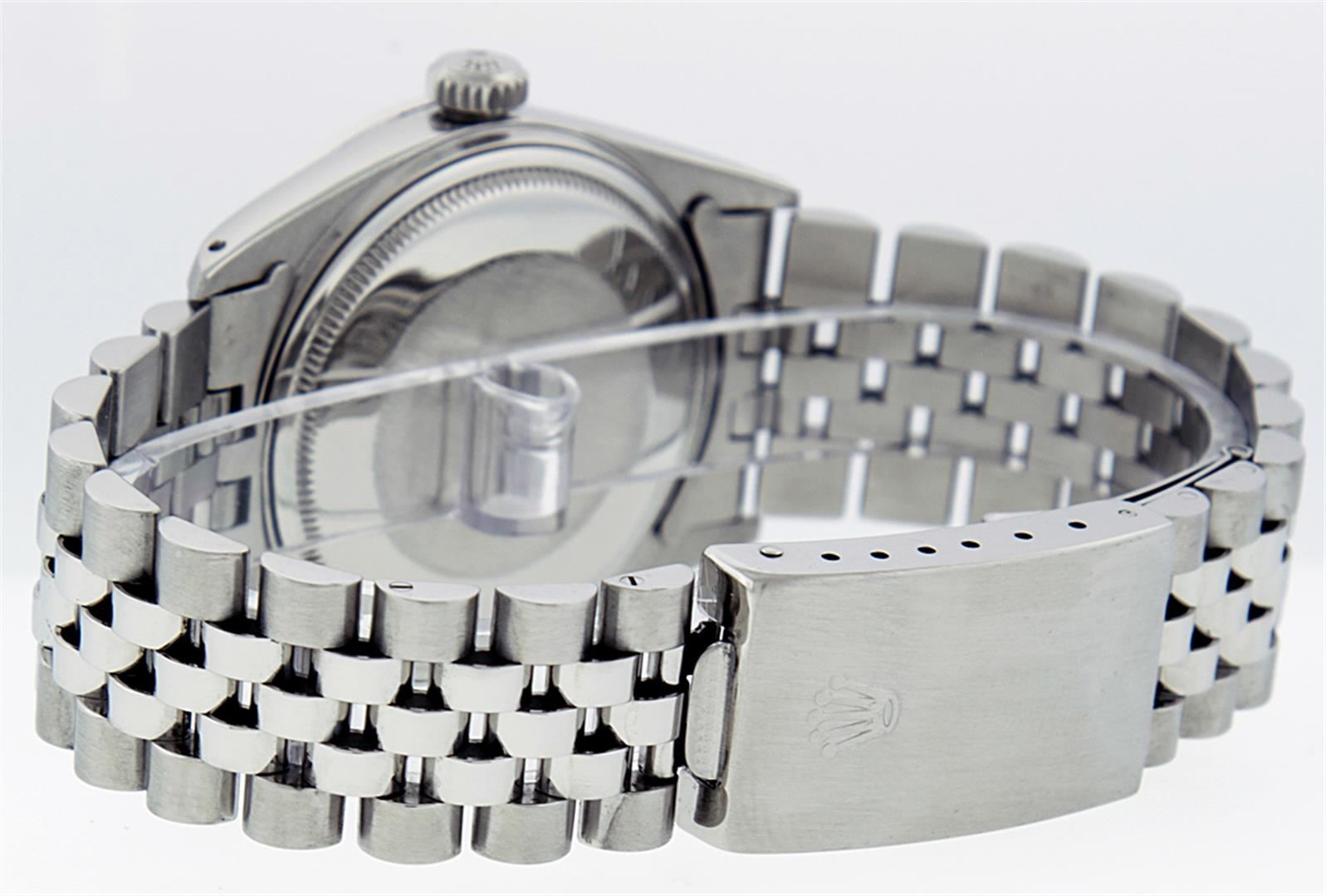 One Mens Rolex Datejust Polished, Serviced & Electronically Tested, Stainless Steel Case:36mm, Stainless Steel Crown, Custom Bezel: 18K White Gold Emerald Beadset Diamond Bezel, Diamond + Gem Count: 36 Diamonds + 4 Emeralds Total Weight 1.00 Carat, Clarity: SI-VS, Color: G to H. Custom Crystal: Synthetic Sapphire Cyclops Lens. Movement: Automatic Winding Movement Caliber 3035. Custom Dial: Green Vignette With Diamond Hour Markers, 10 Diamond Dial G To H In Color, Clarity: SI-VS. Date Window: 3 O'Clock Position Date Display, Quickset, Model: Datejust. Condition: G-6 Extra Fine. Bracelet: Stainless Steel Jubilee. Bright Polish & Satin Finish. 7.0 Inch Length, Adjustable. Standard Clasp, With Rolex Logo