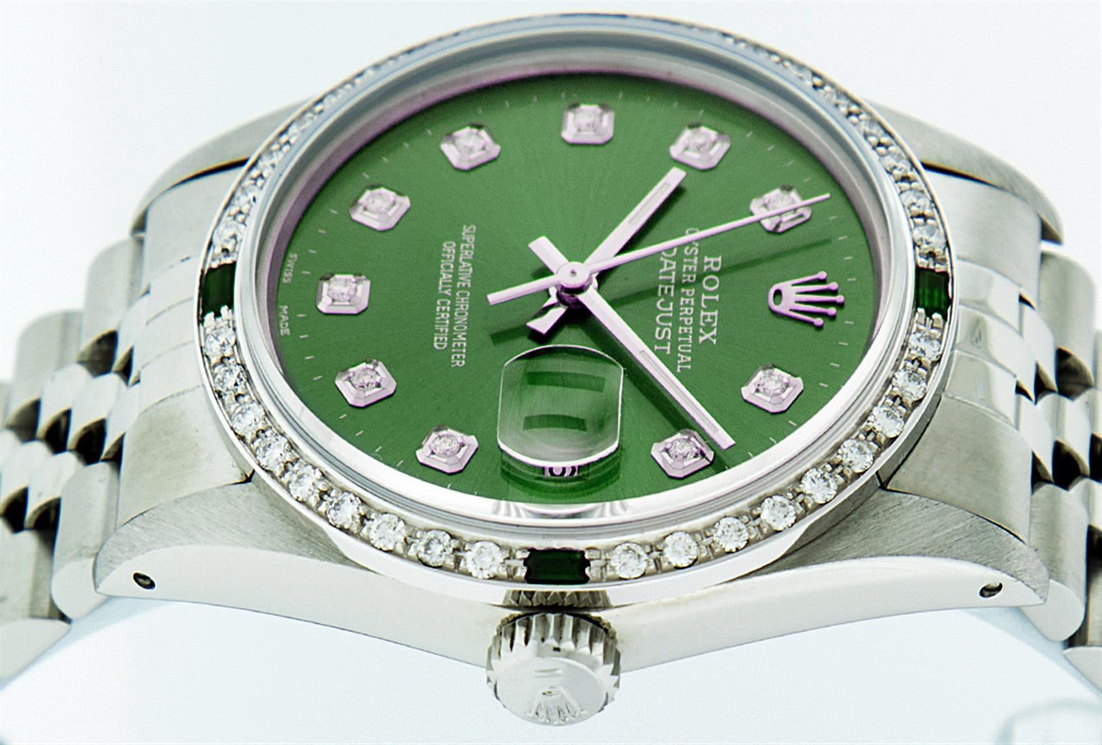 One Gents Rolex Datejust Polished, Serviced & Electronically Tested, Stainless Steel Case:36mm, Stainless Steel Crown, Custom Bezel: 18K White Gold Emerald Beadset Diamond Bezel, Diamond + Gem Count: 36 Diamonds + 4 Emeralds Total Weight 1.00 Carat, Clarity: SI-VS, Color: G to H. Custom Crystal: Synthetic Sapphire Cyclops Lens. Movement: Automatic Winding Movement Caliber 3035. Custom Dial: Green With Diamond Hour Markers, 10 Diamond Dial G To H In Color, Clarity: SI-VS. Date Window: 3 O'Clock Position Date Display, Quickset, Model: Datejust, Condition: G-6 Extra Fine. Bracelet: Stainless Steel Jubilee. Bright Polish & Satin Finish. 7.0 Inch Length, Adjustable. Standard Clasp, With Rolex Logo