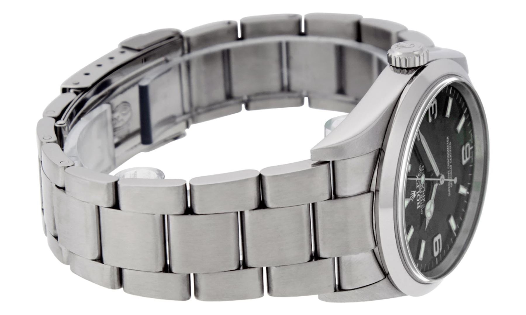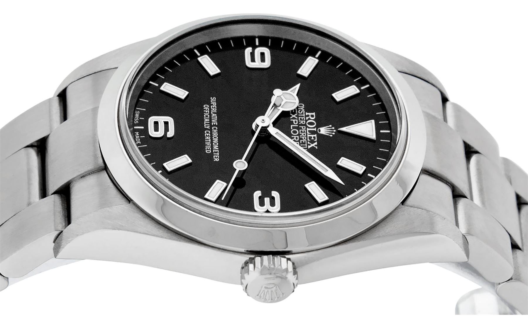 One Mens Pre Owned Rolex Stainless Steel Explorer Polished, Serviced & Electronically Tested, Rolex Stainless Steel Case: 36mm, Rolex Stainless Steel Crown, Rolex Bezel: Rolex Stainless Steel Smooth Domed Bezel. Rolex Crystal: Sapphire With Magnified Date Window. Rolex Movement: Automatic Winding Movement Caliber 3130. Rolex Dial: Rolex Black Dial With Raised Arabic Numerals. Date Window: 3 O'Clock Position Date Display, Model: Explorer, Condition: G-6 Extra Fine. Rolex Bracelet: Rolex Stainless Steel Oyster Bracelet, Bright Polish & Satin Finish. 7 Inch Length, Adjustable. Flip Lock Clasp with Rolex Logo. This Watch Has Been Serviced Time Tested And Is In Excellent Condition It Is Free Of All Scratches And Dents.
