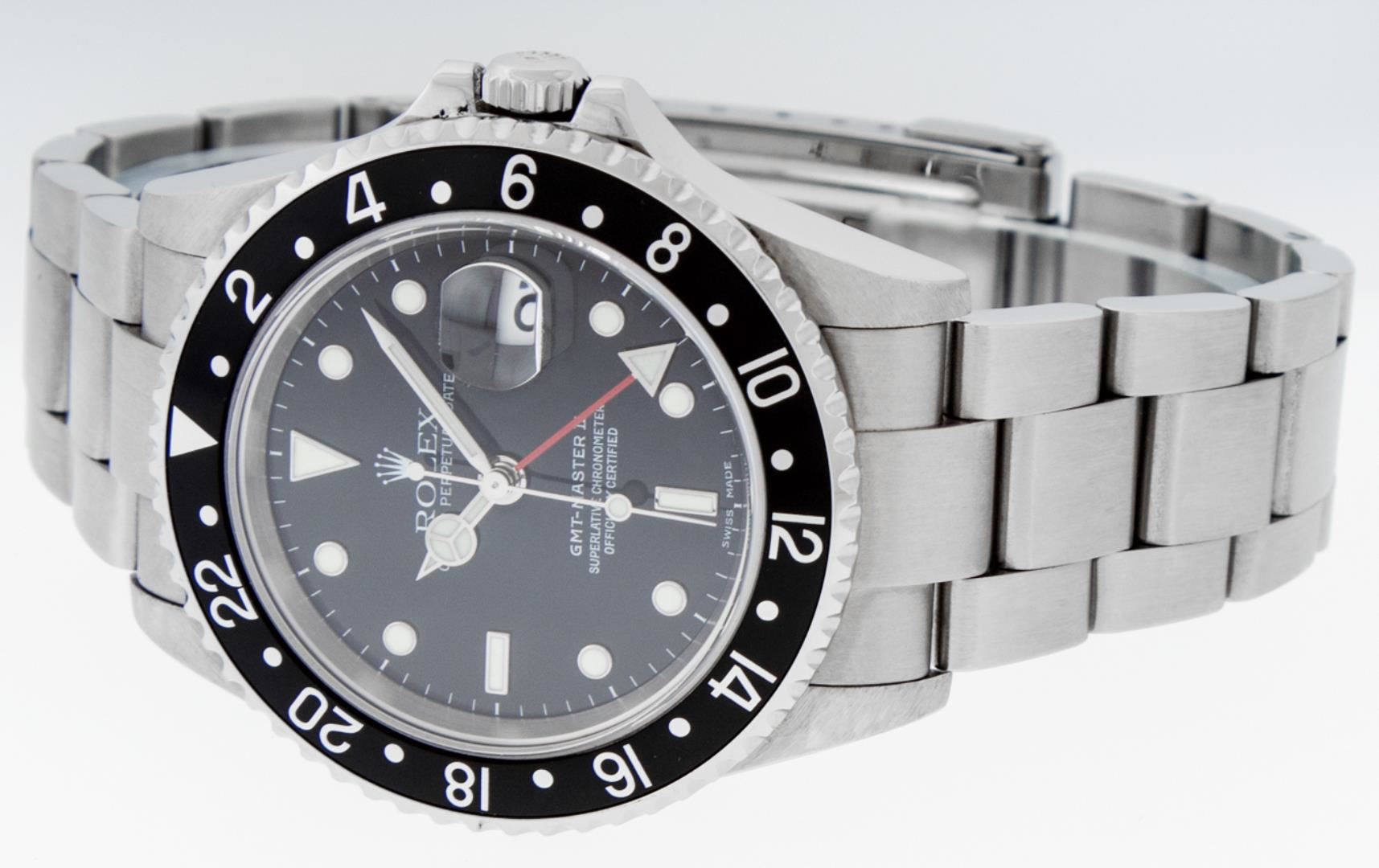 One Mens Pre Owned Rolex Stainless Steel GMT Master 2 Polished, Serviced & Electronically Tested, Rolex Stainless Steel Case: 40mm, Rolex Stainless Steel Crown, Rolex Bezel: Stainless Steel Bi Directional Rotatable Bezel With Black Insert. Rolex Crystal: Sapphire Crystal With Magnified Date Window. Rolex Movement: Automatic Winding Movement Caliber 3186. Dial: Rolex GMT Master 2 Black Dial, Date Window: 3 O'Clock Position Date Display, Model: GMT Master 2, Quickset, Condition: G-6 Extra Fine. Rolex Bracelet: Stainless Steel Oyster Band. Bright Polish & Satin Finish. 7.0 Inch Length, Adjustable. Standard Clasp, With Rolex Logo. This Watch Has Been Serviced Time Tested And Is In Excellent Condition It Is Free Of All Scratches And Dents.