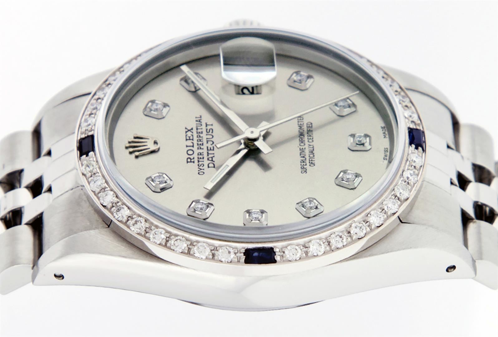 One Mens Stainless Steel Rolex Datejust Polished Bright with Satin Finish, This Watch Has Been Serviced & Electronically Tested, Stainless Steel Case: 36mm, Stainless Steel Crown, Custom Bezel: New 18K White Gold Sapphire Beadset Diamond Bezel, Diamond + Gem Count: 36 Diamonds + 4 Sapphires, Total Weight 1.00 Carat, Clarity: SI-VS, Color: G to H. Custom Crystal: New Synthetic Sapphire Cyclops Lens. Custom Hands: New Luminescent Hands. Movement: Automatic Winding Movement. Custom Dial: Slate Grey With Diamond Hour Markers, Diamond Count: 10 Diamonds in Dial, Diamond Color: G To H In Color, Clarity: SI-VS. Date Window: 3 O'Clock Position Date Display, Quickset, Model: Datejust, Condition: G-6 Extra Fine. Bracelet: Stainless Steel Jubilee. Bracelet: 7.0 Inch Length, Adjustable. Standard Clasp, With Rolex Logo. This Watch Has Been Serviced Time Tested And Is In Excellent Condition It Is Free Of All Scratches And Dents.