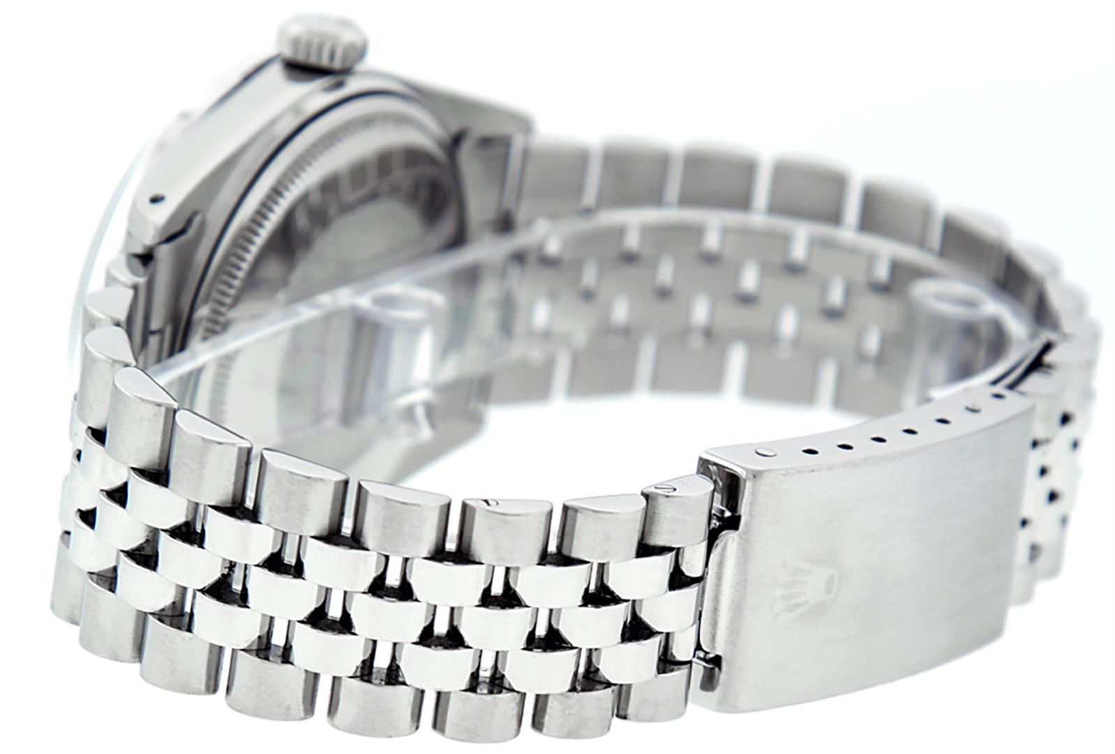 One Mens Stainless Steel Rolex Datejust Polished, Serviced & Electronically Tested, Stainless Steel Case: 36mm, Stainless Steel Crown, Custom Bezel: New 18K White Gold Beadset Diamond Bezel, Diamond Count: 44 Diamonds In Bezel, Total Weight 1.00 Carat, Clarity: SI-VS, Color: G to H. Custom Crystal: New Scratch Resistant Synthetic Sapphire Cyclops Lens. Custom Hands: New Luminescent Hands. Movement: Automatic Winding Movement Caliber 3035. Custom Dial: Green Diamond Dial, Diamond Count: 10 Diamonds in Dial, G To H In Color, Clarity: SI-VS. Date Window: 3 O'Clock Position Date Display, Quickset, Model: Datejust. Condition: G-6 Extra Fine. Bracelet: Stainless Steel Jubilee Band. Bright Polish & Satin Finish. 7.0 Inch Length, Adjustable. Standard Clasp, With Rolex Logo. This Watch Has Been Serviced Time Tested And Is In Excellent Condition It Is Free Of All Scratches And Dents.