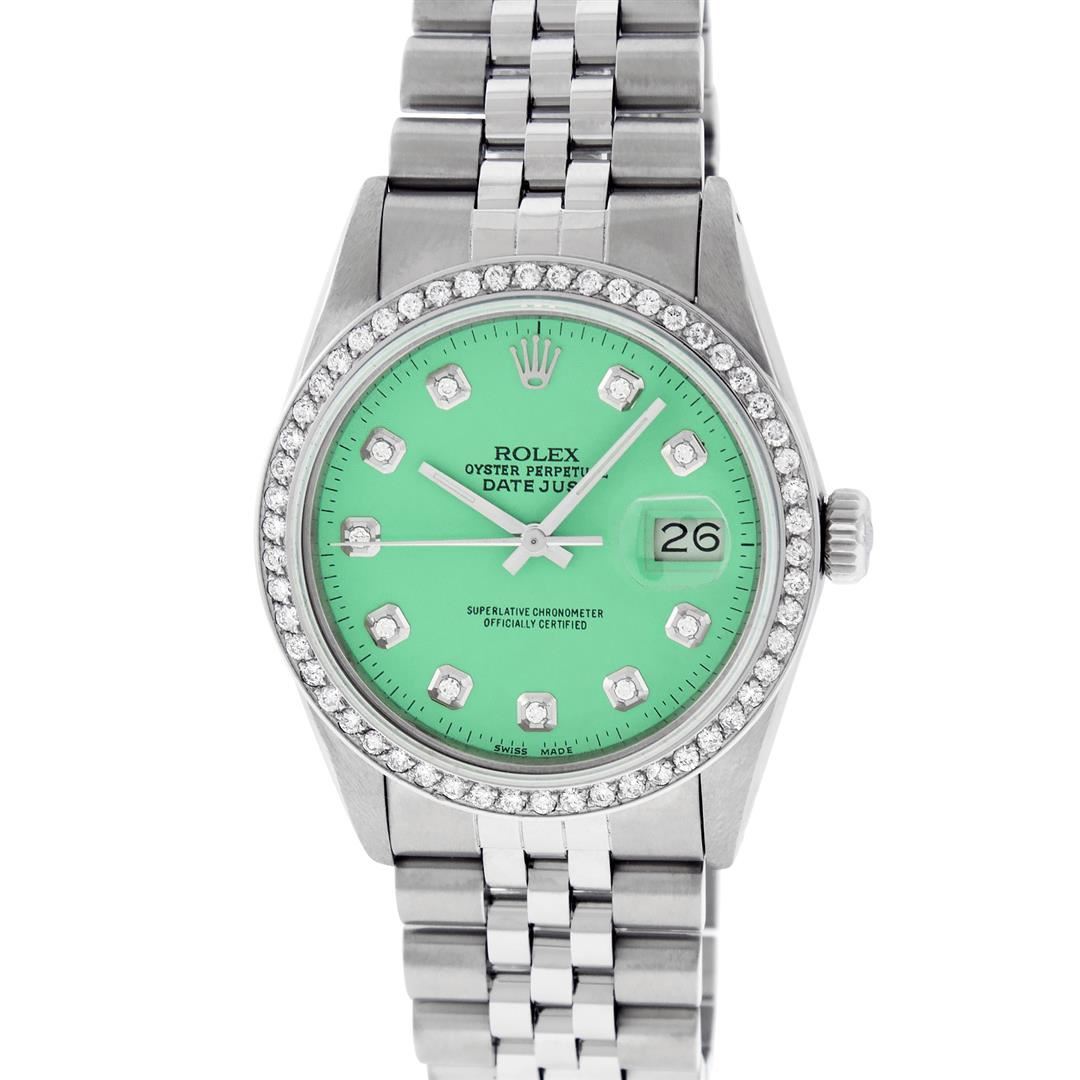One Mens Rolex Stainless Steel Datejust Polished Bright with Satin Finish, This Watch Has Been Serviced & Electronically Tested, Stainless Steel Case: 36mm, Stainless Steel Crown, Custom Bezel: New Stainless Steel Beadset Diamond Bezel, Diamond Count: 54 Diamonds In Bezel, Total Weight 1.00 Carat, Clarity: SI-VS, Color: G to H. Custom Crystal: New Scratch Resistant Synthetic Sapphire Cyclops Lens. Custom Hands: New Luminescent Hands. Movement: Automatic Winding Movement Caliber 3035. Custom Dial: Green Diamond Dial With Dash Track, Diamond Count: 10 Diamonds On Dial, Color: G to H, Clarity: VS2-SI1. Date Window: 3 O'Clock Position Date Display, Quickset, Model: Datejust. Condition: G-6 Extra Fine. Bracelet: Stainless Steel Jubilee Band. Bright Polish & Satin Finish. 7.0 Inch Length, Adjustable. Standard Clasp, With Rolex Logo. This Watch Has Been Serviced Time Tested And Is In Excellent Condition It Is Free Of All Scratches And Dents.