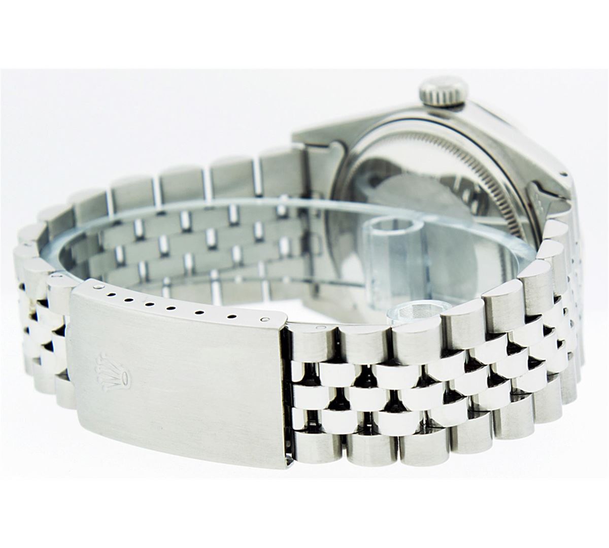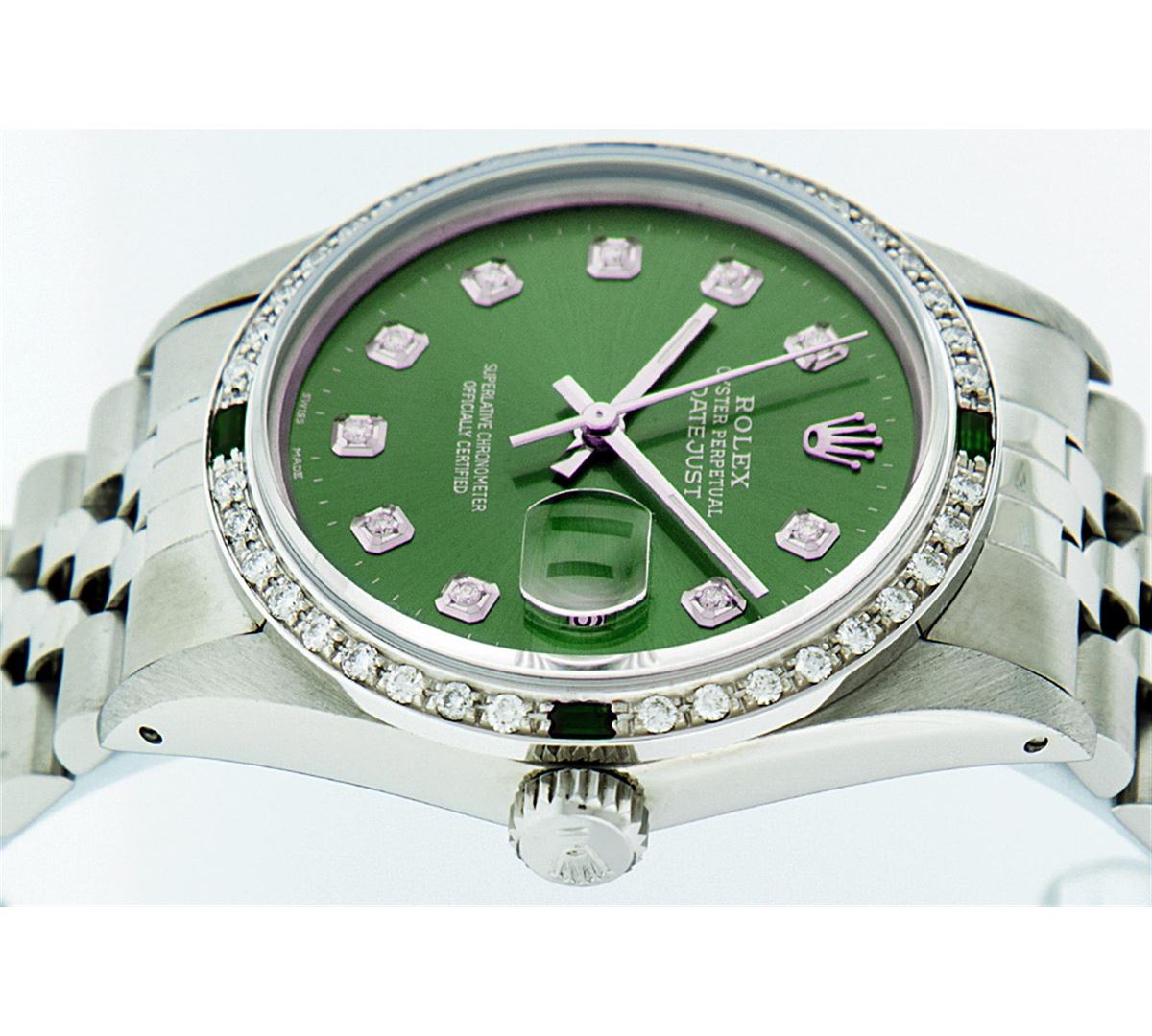 One Gents Rolex Datejust Polished, Serviced & Electronically Tested, Stainless Steel Case:36mm, Stainless Steel Crown, Custom Bezel: 18K White Gold Emerald Beadset Diamond Bezel, Diamond + Gem Count: 36 Diamonds + 4 Emeralds Total Weight 1.00 Carat, Clarity: SI-VS, Color: G to H. Custom Crystal: Synthetic Sapphire Cyclops Lens. Movement: Automatic Winding Movement Caliber 3035. Custom Dial: Green With Diamond Hour Markers, 10 Diamond Dial G To H In Color, Clarity: SI-VS. Date Window: 3 O'Clock Position Date Display, Quickset, Model: Datejust, Condition: G-6 Extra Fine. Bracelet: Stainless Steel Jubilee. Bright Polish & Satin Finish. 7.0 Inch Length, Adjustable. Standard Clasp, With Rolex Logo