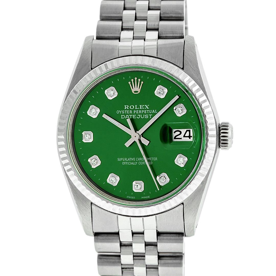 One Mens Stainless Steel Rolex Datejust Polished Bright with Satin Finish, This Watch Has Been Serviced & Electronically Tested, Stainless Steel Case: 36mm, Stainless Steel Crown, Bezel: 14K White Gold Fluted Bezel. Custom Crystal: New Acrylic Cyclops Len
