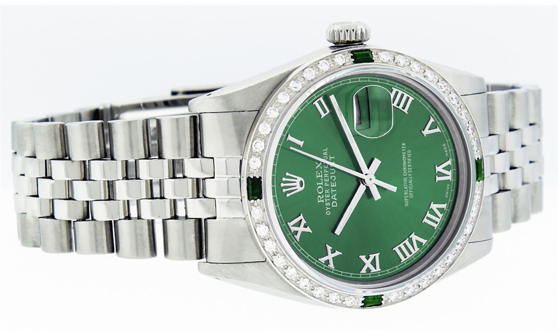 One Mens Stainless Steel Rolex Datejust Polished Bright with Satin Finish, This Watch Has Been Serviced & Electronically Tested, Stainless Steel Case: 36mm, Stainless Steel Crown, Custom Bezel: New 18K White Gold Emerald Beadset Diamond Bezel, Diamond + Gem Count: 36 Diamonds + 4 Emeralds, Total Weight 1.00 Carat, Clarity: SI-VS, Color: G to H. Custom Crystal: New Scratch Resistant Synthetic Sapphire Cyclops Lens. Custom Hands: New Luminescent Hands. Movement: Automatic Winding Movement Caliber 3035. Custom Dial: Green With Roman Track & Square Track. Date Window: 3 O'Clock Position Date Display, Quickset, Model: Datejust, Condition: G-6 Extra Fine. Bracelet: Stainless Steel Jubilee Band. Bracelet: 7.0 Inch Length, Adjustable. Standard Clasp, With Rolex Logo. This Watch Has Been Serviced Time Tested And Is In Excellent Condition It Is Free Of All Scratches And Dents.