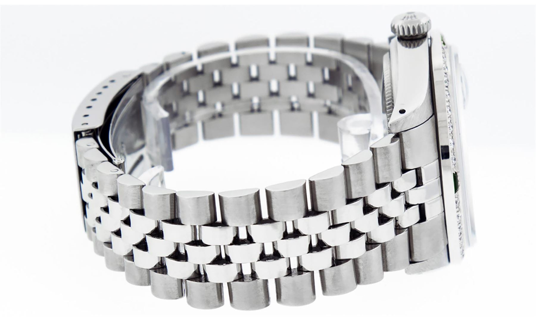One Mens Stainless Steel Rolex Datejust Polished Bright with Satin Finish, This Watch Has Been Serviced & Electronically Tested, Stainless Steel Case: 36mm, Stainless Steel Crown, Custom Bezel: New 18K White Gold Emerald Beadset Diamond Bezel, Diamond + Gem Count: 36 Diamonds + 4 Emeralds, Total Weight 1.00 Carat, Clarity: SI-VS, Color: G to H. Custom Crystal: New Scratch Resistant Synthetic Sapphire Cyclops Lens. Custom Hands: New Luminescent Hands. Movement: Automatic Winding Movement Caliber 3035. Custom Dial: Green With Roman Track & Square Track. Date Window: 3 O'Clock Position Date Display, Quickset, Model: Datejust, Condition: G-6 Extra Fine. Bracelet: Stainless Steel Jubilee Band. Bracelet: 7.0 Inch Length, Adjustable. Standard Clasp, With Rolex Logo. This Watch Has Been Serviced Time Tested And Is In Excellent Condition It Is Free Of All Scratches And Dents.