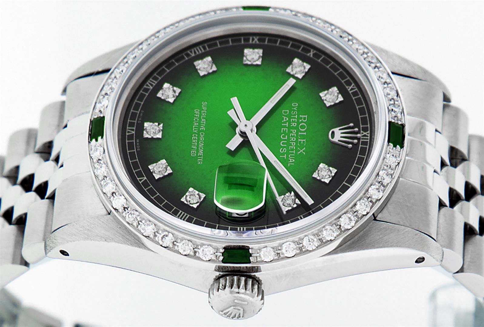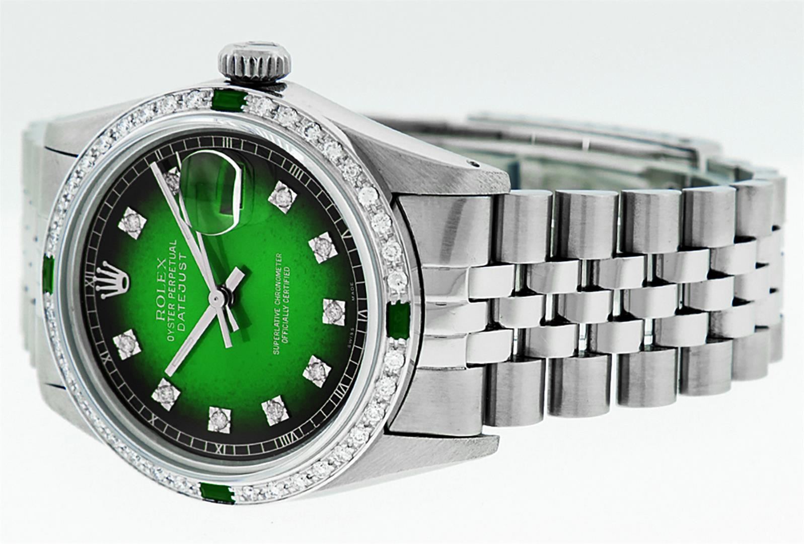 One Mens Stainless Steel Rolex Datejust Polished, Serviced & Electronically Tested, Stainless Steel Case: 36mm, Stainless Steel Crown, Custom Bezel: New 18K White Gold Emerald Beadset Diamond Bezel, Diamond + Gem Count: 36 Diamonds + 4 Emeralds, Total Weight 1.00 Carat, Clarity: SI-VS, Color: G to H. Custom Crystal: New Scratch Resistant Synthetic Sapphire Cyclops Lens. Custom Hands: New Luminescent Hands. Movement: Automatic Winding Movement Caliber 3035. Custom Dial: Green Vignette Diamond Dial With Roman Track, 10 Diamonds in Dial, G To H In Color, Clarity: SI-VS. Date Window: 3 O'Clock Position Date Display, Quickset, Model: Datejust. Condition: G-6 Extra Fine. Bracelet: Stainless Steel Jubilee Band. Bright Polish & Satin Finish. 7.0 Inch Length, Adjustable. Standard Clasp, With Rolex Logo. This Watch Has Been Serviced Time Tested And Is In Excellent Condition It Is Free Of All Scratches And Dents.