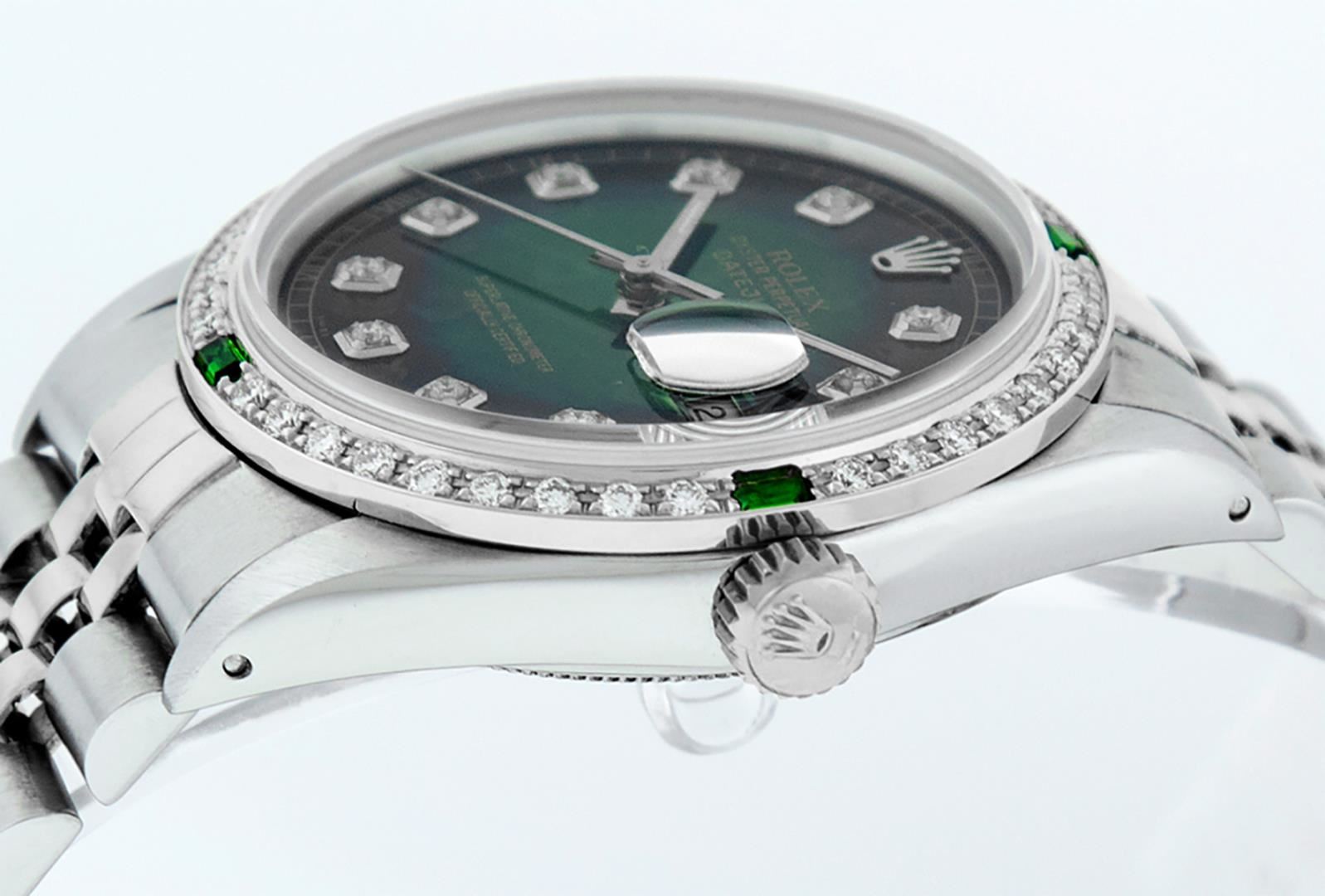 One Pre Owned Stainless Steel 36MM Rolex Datejust Polished, Serviced & Electronically Tested, Rolex Stainless Steel Case: 36mm, Rolex Stainless Steel Crown, Custom Bezel: New 18K White Gold Emerald Beadset Diamond Bezel, Diamond + Gem Count: 36 Diamonds + 4 Emeralds. Custom Crystal: New Sapphire With Magnified Date. Custom Hands: New Luminescent Hands. Rolex Movement: Automatic Winding Movement 3035. Custom Dial: Custom Green Vignette Dial With Added Diamond Hour Markers, 10 Diamonds In Dial. Date Window: 3 O'Clock Position Date Display, Quickset, Model: Quickset Datejust. Condition: G-6 Extra Fine. Rolex Bracelet: Stainless Steel Jubilee Band. Bright Polish & Satin Finish. 7.0 Inch Length, Adjustable. Fold Clasp, With Rolex Logo. This Watch Has Been Serviced Time Tested And Is In Excellent Condition It Is Free Of All Scratches And Dents.