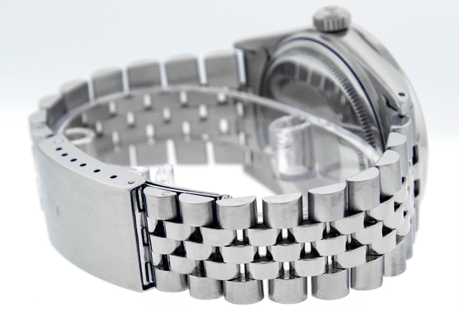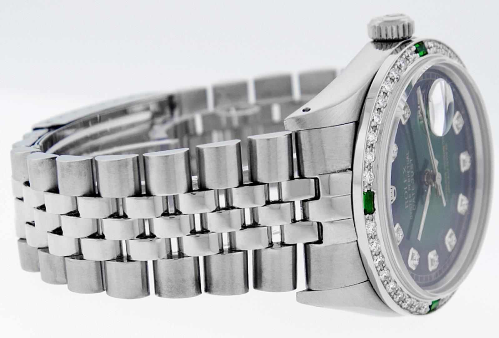 One Pre Owned Stainless Steel 36MM Rolex Datejust Polished, Serviced And Electronically Tested, Rolex Stainless Steel Case: 36mm, Rolex Stainless Steel Crown, Custom Bezel: New 18K White Gold Emerald Beadset Diamond Bezel, Diamond + Gem Count: 36 Diamonds + 4 Emeralds. Custom Crystal: New Sapphire With Magnified Date. Custom Hands: New Luminescent Hands. Rolex Movement: Automatic Winding Movement 3035. Custom Dial: Custom Green Vignette Dial With Added Diamond Hour Markers, 10 Diamonds In Dial. Date Window: 3 O'Clock Position Date Display, Quickset, Model: Quickset Datejust. Condition: G-6 Extra Fine. Rolex Bracelet: Stainless Steel Jubilee Band. Bright Polish & Satin Finish. 7.0 Inch Length, Adjustable. Fold Clasp, With Rolex Logo. This Watch Has Been Serviced Time Tested And Is In Excellent Condition It Is Free Of All Scratches And Dents.