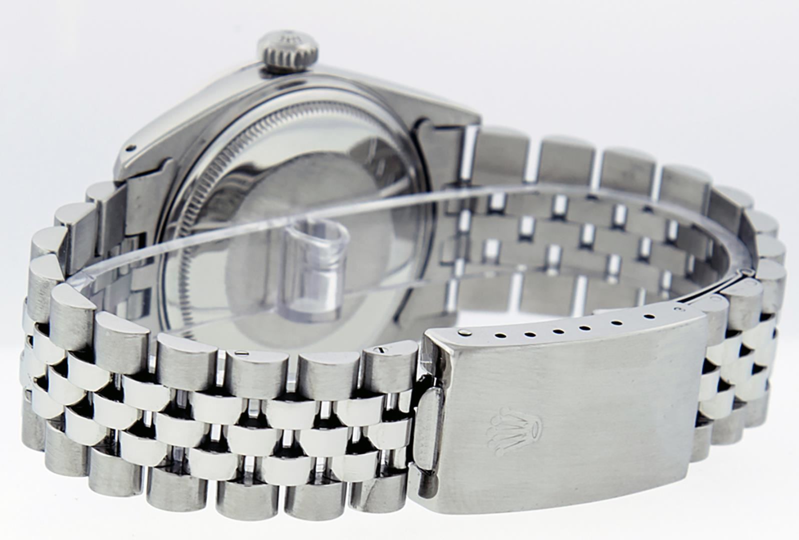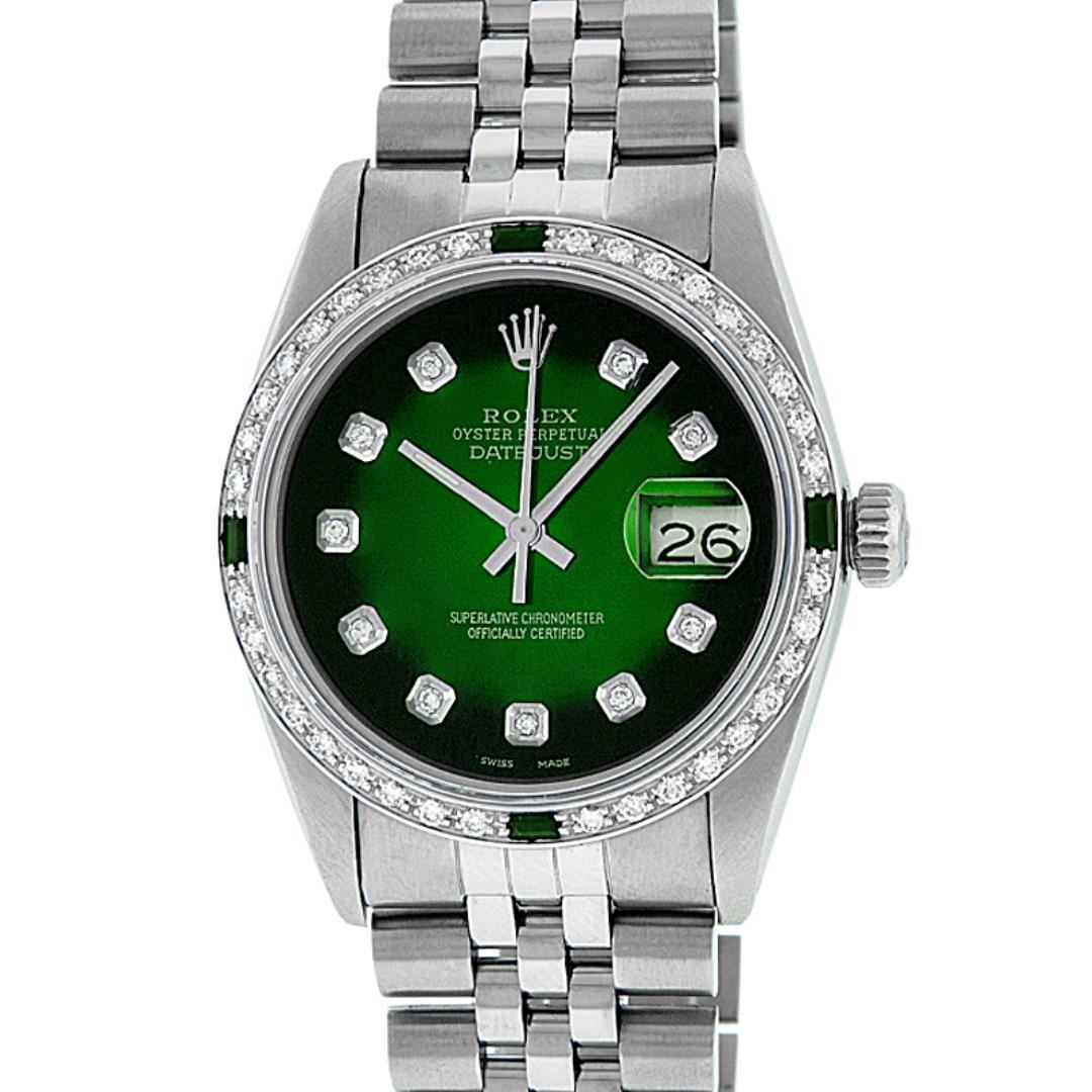 One Mens Pre Owned Rolex Datejust Polished, Serviced And Electronically Tested, Stainless Steel Case: 36mm, Stainless Steel Crown, Custom Bezel: 18K White Gold Emerald Beadset Diamond Bezel, Diamond + Gem Count: 36 Diamonds + 4 Emeralds. Custom Crystal: New Sapphire With Magnified Date Window. Custom Hands: New Luminescent Hands. Rolex Movement: Automatic Winding Movement 3035. Custom Dial: Custom Green Vignette With Added Diamond Hour Markers, 10 Diamonds In Dial. Date Window: 3 O'Clock Position Date Display, Quickset, Model: Quickset Datejust. Condition: G-6 Extra Fine. Rolex Bracelet: Stainless Steel Jubilee Band. Bright Polish And Satin Finish. 7.0 Inch Length, Adjustable. Standard Clasp, With Rolex Logo. This Watch Has Been Serviced Time Tested And Is In Excellent Condition It Is Free Of All Scratches And Dents.