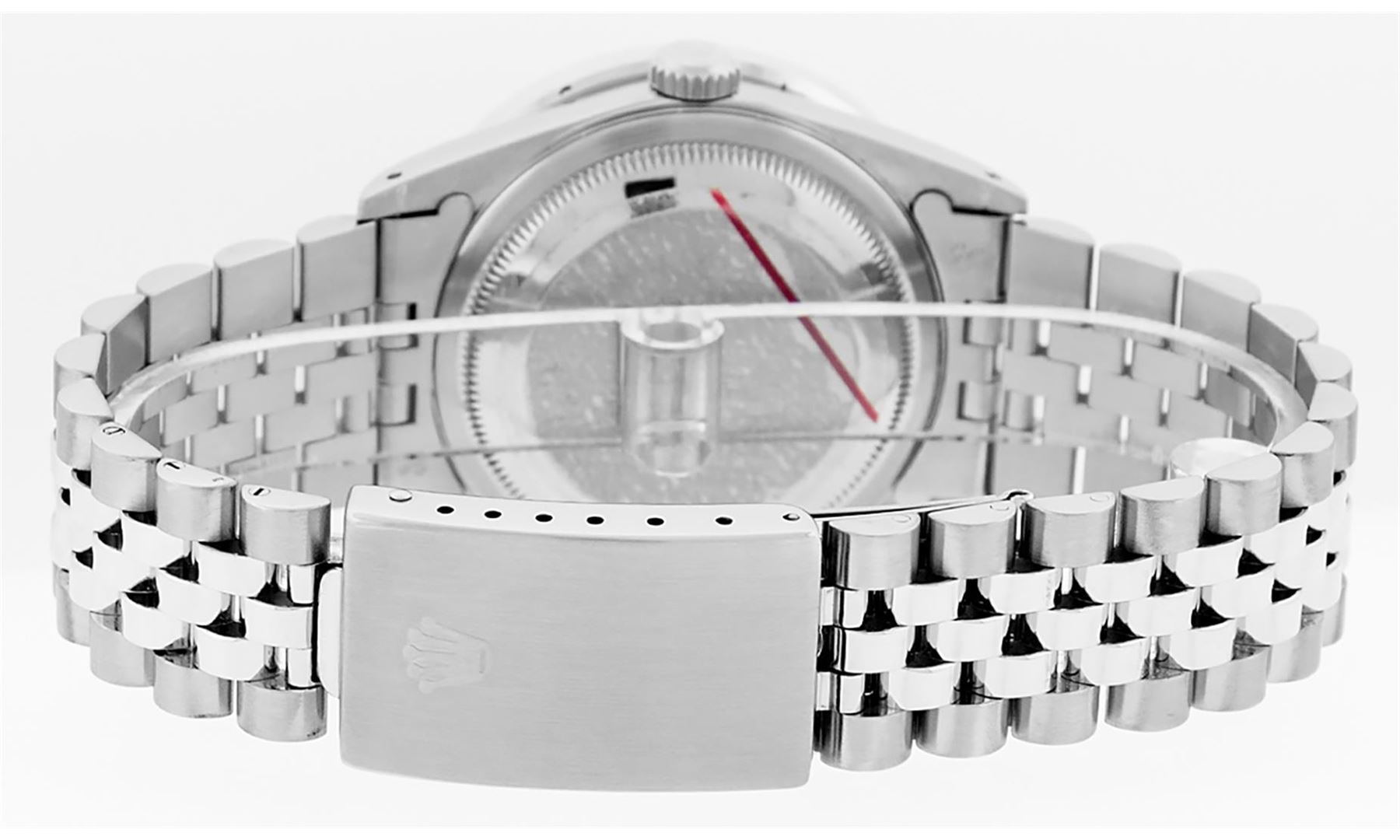 One Mens Stainless Steel Rolex Datejust Polished Bright with Satin Finish, Serviced & Electronically Tested, Stainless Steel Case: 36mm, Diamond Lugs: 24 Diamonds On Lugs, Color: G to H, Clarity: SI-VS. Stainless Steel Crown, New Custom Bezel: 18K White Gold 3.00 Ctw Diamond Bezel, Diamond Count: 40 Diamonds, Total Weight 3.0 Carat, Clarity: SI-VS, Color: G to H. Custom Crystal: New Scratch Resistant Synthetic Sapphire Cyclops Lens. Movement: Automatic Winding Movement Caliber 3035. Custom Dial: Green Vignette Roman Diamond Dial, Diamond Color: G To H In Color, Clarity: SI-VS. Date Window: 3 O'Clock Position Date Display, Quickset, Model: Quickset Datejust, Condition: G-6 Extra Fine. Bracelet: Stainless Steel Jubilee Band. Bright Polish & Satin Finish. 7.0 Inch Length, Adjustable. Standard Clasp, With Rolex Logo. This Watch Has Been Serviced Time Tested And Is In Excellent Condition It Is Free Of All Scratches And Dents. This Watch Also Comes With A Brand New Wooden Watch Winder.
