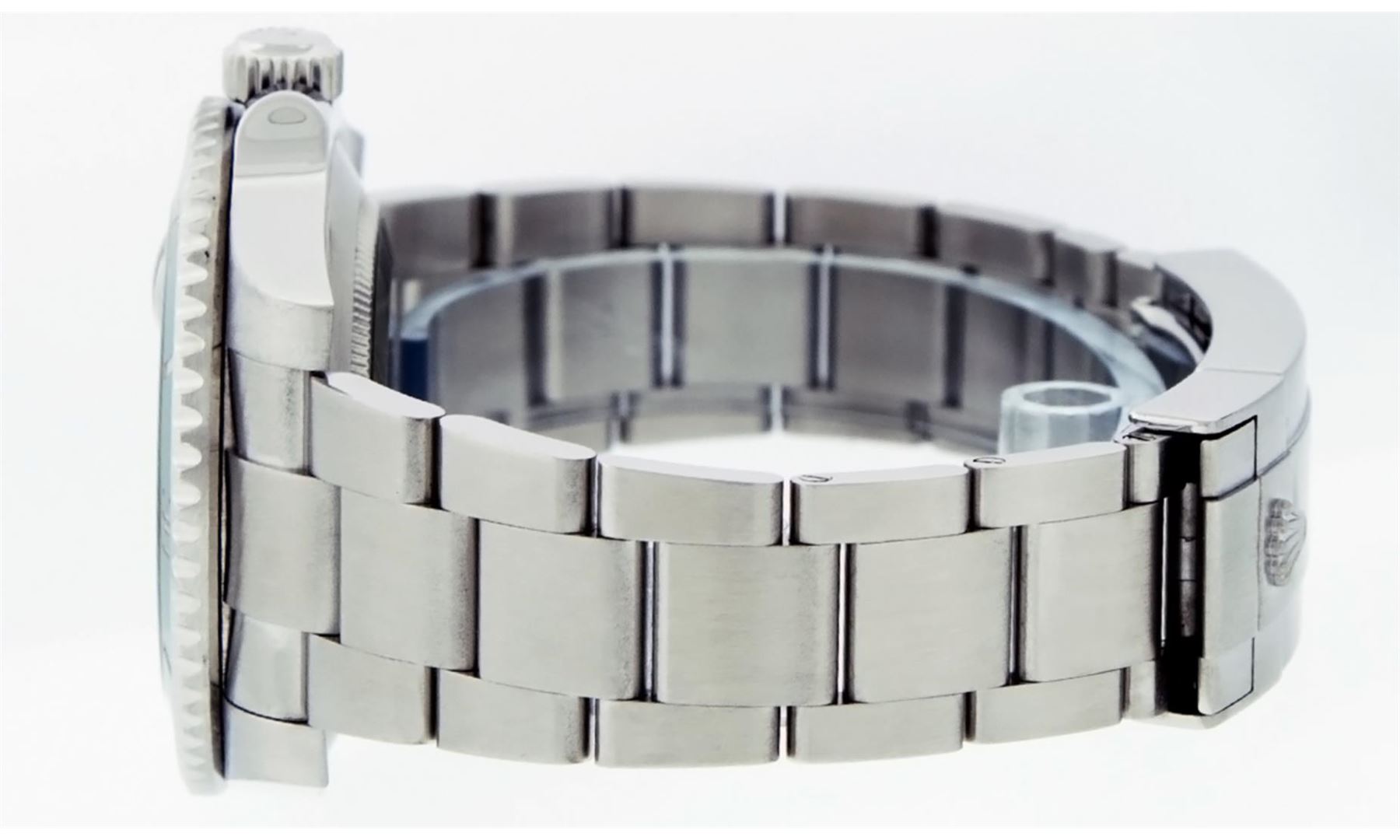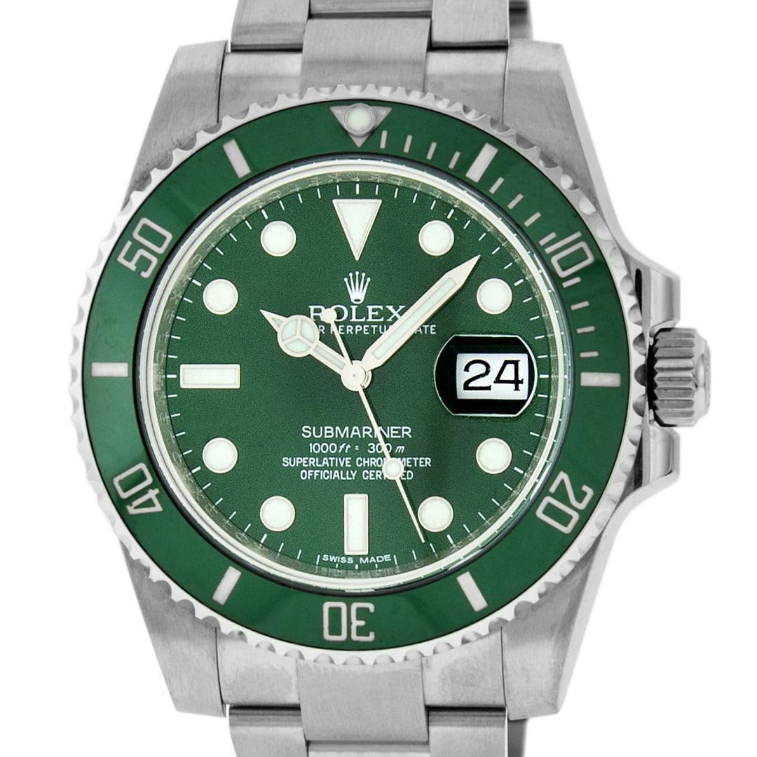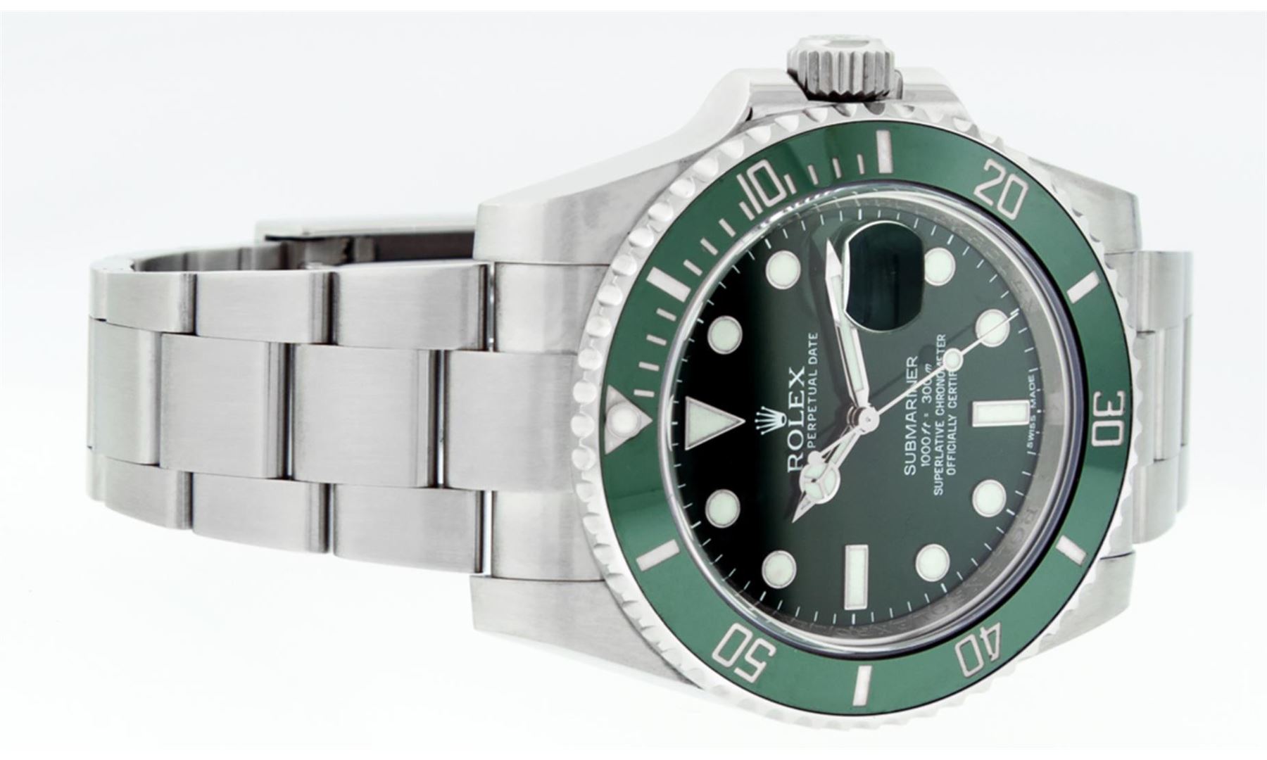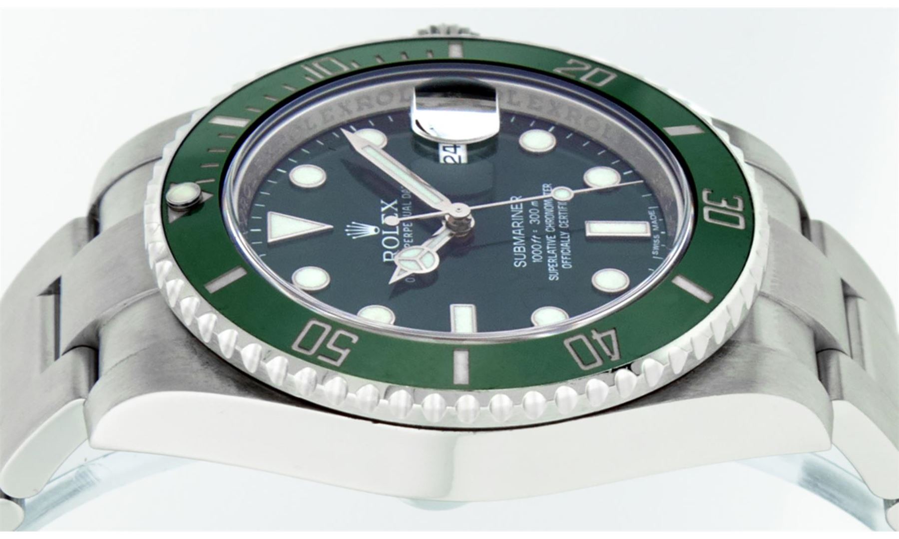 One Mens Pre Owned Rolex Submariner With Date Polished, Serviced & Electronically Tested, Stainless Steel Case: 40mm, Stainless Steel Crown, Custom Bezel: Stainless Steel With Rotatable Bezel With Green Ceramic Insert. Crystal: Sapphire With Magnified Date Window. Rolex Movement: Automatic Winding Movement Caliber 3135. Rolex Dial: Green Rolex Submariner Dial. Date Window: 3 O'Clock Position Date Display, Model: Submariner 116610LV, Quickset, Condition: G-6 Extra Fine. Rolex Bracelet: Stainless Steel Oyster. Bright Polish & Satin Finish. 7.0 Inch Length, Adjustable. Standard Clasp, With Rolex Logo.