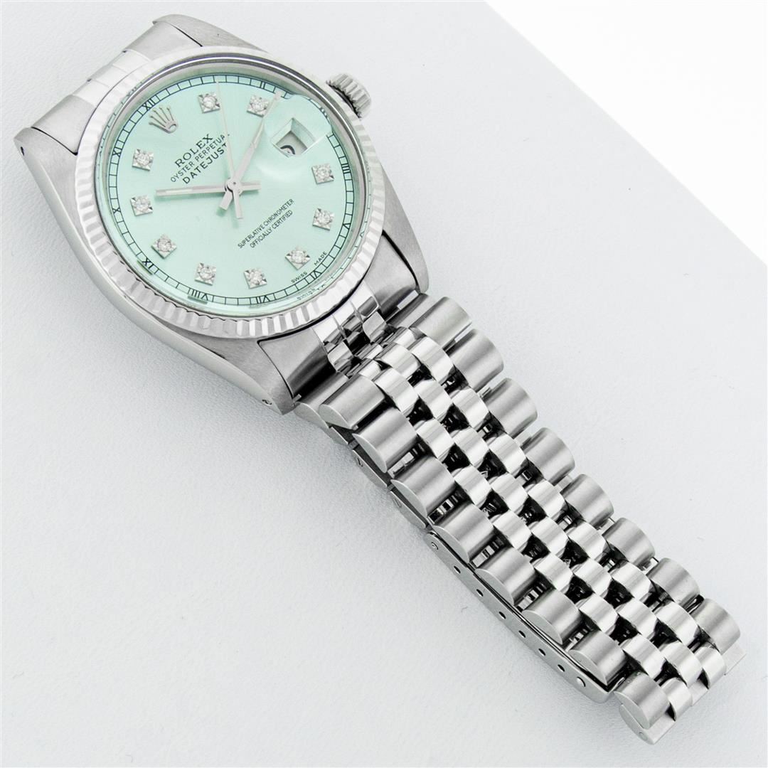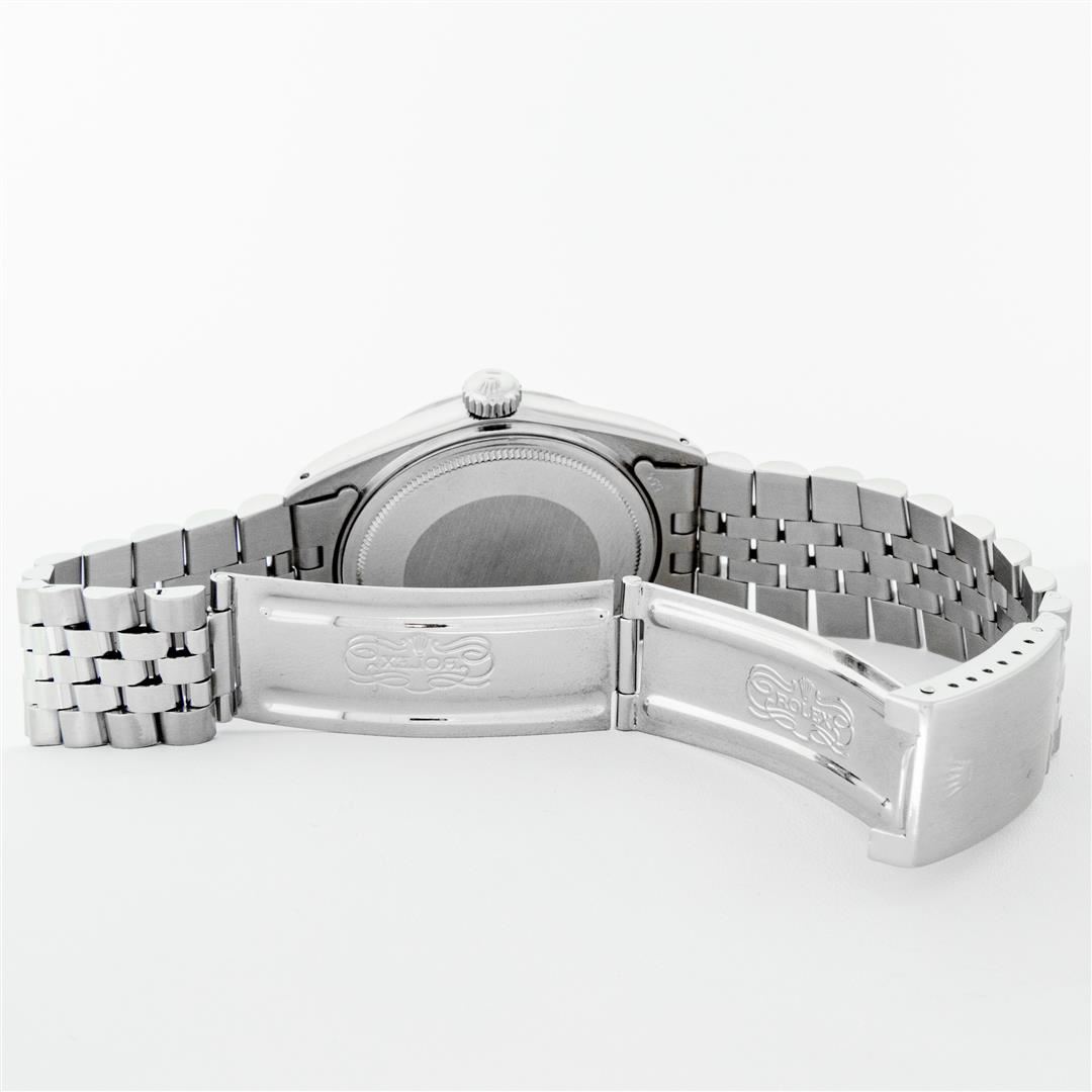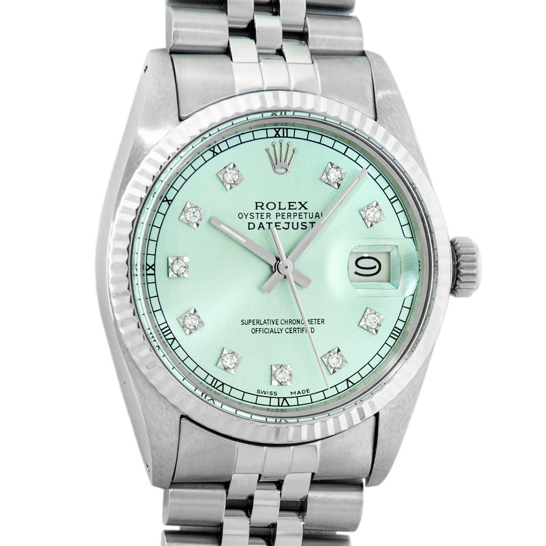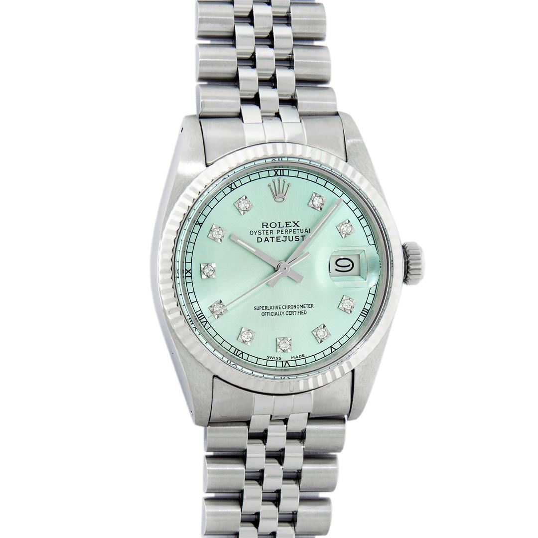 One Mens Stainless Steel Rolex Datejust Polished Bright with Satin Finish, This Watch Has Been Serviced & Electronically Tested, Stainless Steel Case: 36mm, Stainless Steel Crown, Bezel: 14K White Gold Fluted Bezel. Custom Crystal: New Acrylic Cyclops Len